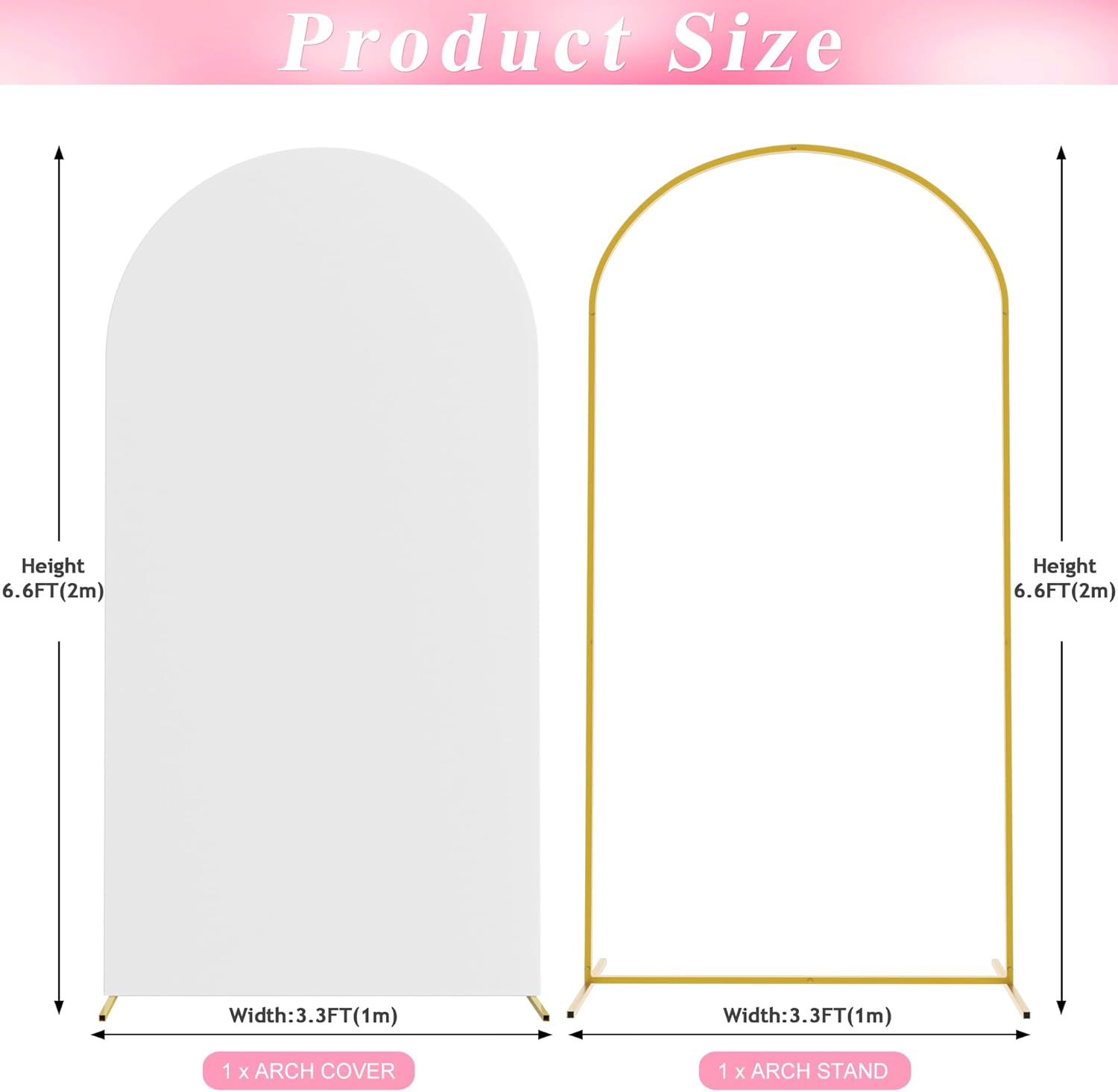 • 【Arch Backdrop Stand and Covers Package】Package contains 1pcs wedding arch stand and 1pcs arch cover. Size: 6.6x3.3ft(HxW). Material: metal arch backdrop stand and spandex arch cover. Color: White arch cover and gold wedding arch stand. Decorate your party with our gold arch stand and arch covers to create an epic decor for your celebration.