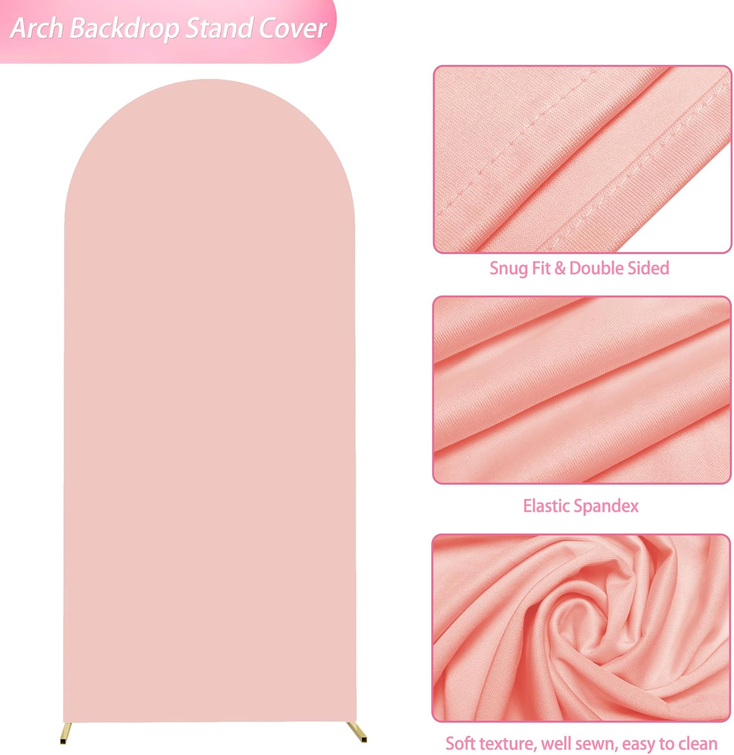 • 【Arch Stand and Covers Package】Package contains 1pcs wedding arch stand and 1pcs arch cover. Size: 6x2.6ft(HxW). Material: metal arch backdrop stand and spandex arch cover. Color: Pale Pink arch cover and gold wedding arch stand. Decorate your party with our gold arch stand and arch covers to create an epic decor for your celebration.