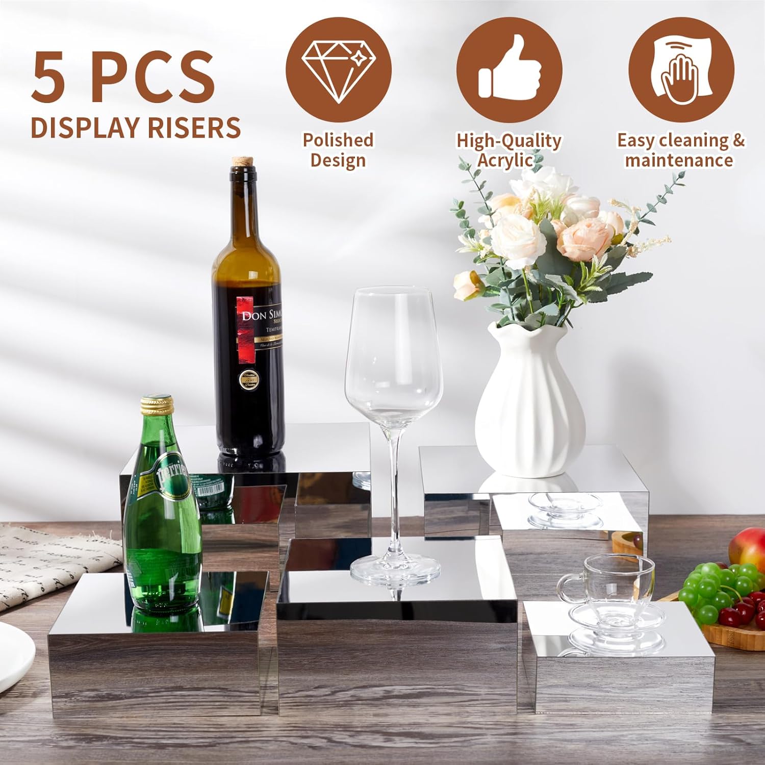 • Acrylic Display Risers EXQUISITE DISPLAY BOX:With the smooth surface and mirror polished design the acrylic cube display box is elegant and stylish, always shine and easily match the color and style of your tabletop or dining table.Acrylic Cube Boxes