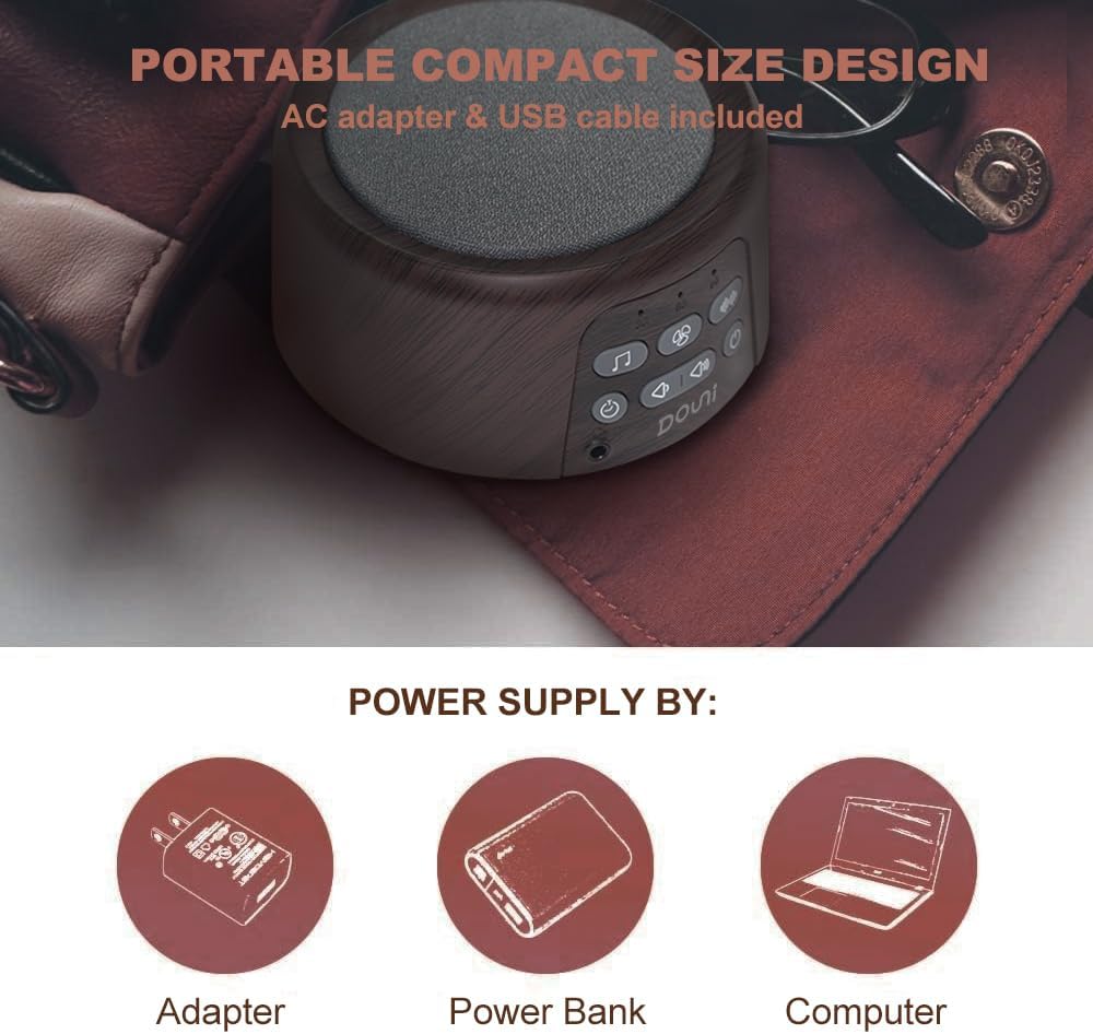 • AESTHETICALLY PLEASING & PORTABLE SIZE: Adorned with a luxurious deep brown wood grain finish, the DOUNI White Noise Machine adds a touch of sophistication to any space. it comes with power adapter and cord so you can take it wherever you go. this white noise machine fits seamlessly on bedside tables or desks, perfect for home, office, or travel use.