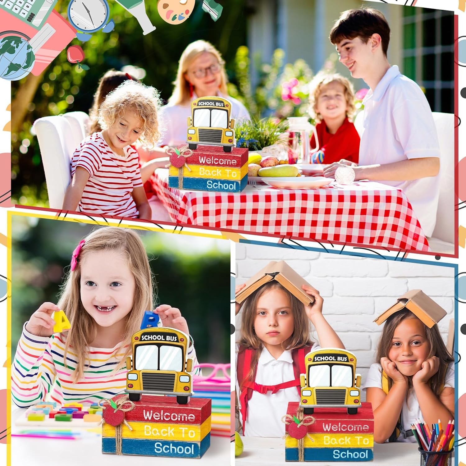 4 Pcs Back to School Table Decorations First Day of School Tiered Tray Decorations Decorative Mini Wooden Books Subject Signs for Office Shelf Classroom Tabletop Bookshelf(Bus)