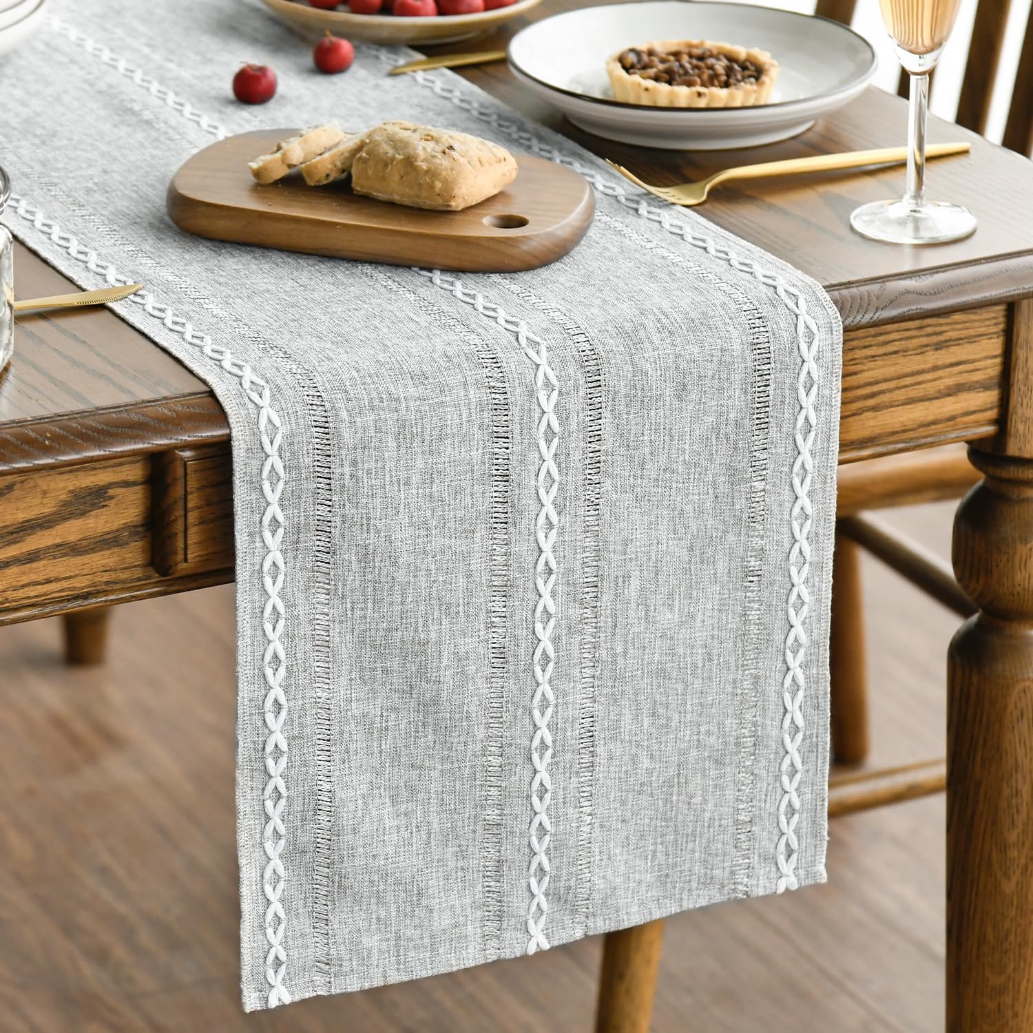 Artoid Mode Grey Rustic Cotton Linen Table Runner, Seasonal Embroidered Hollow Kitchen Dining Table Decoration for Home Party Decor 13x36 Inch