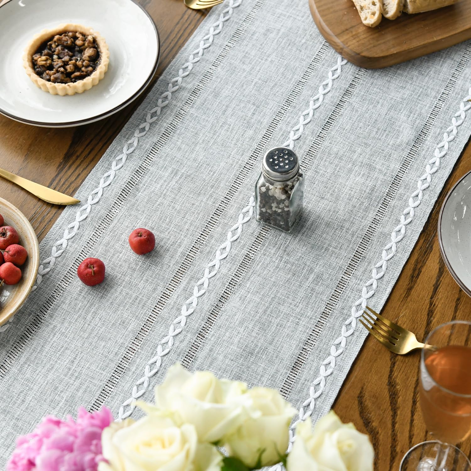 Artoid Mode Grey Rustic Cotton Linen Table Runner, Seasonal Embroidered Hollow Kitchen Dining Table Decoration for Home Party Decor 13x108 Inch