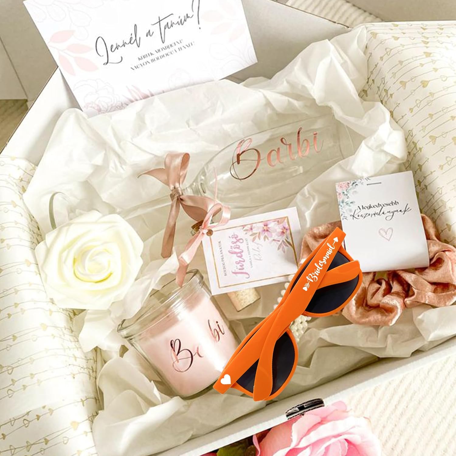 • Bachelorette Sunglasses---This Bachelorette Party supplies kit contains a total of 1 Pair of white 'Bride' Sunglasses, 9 Pairs of terracotta 'Bridesmaid' Sunglasses. Great idea for Bachelorette party.