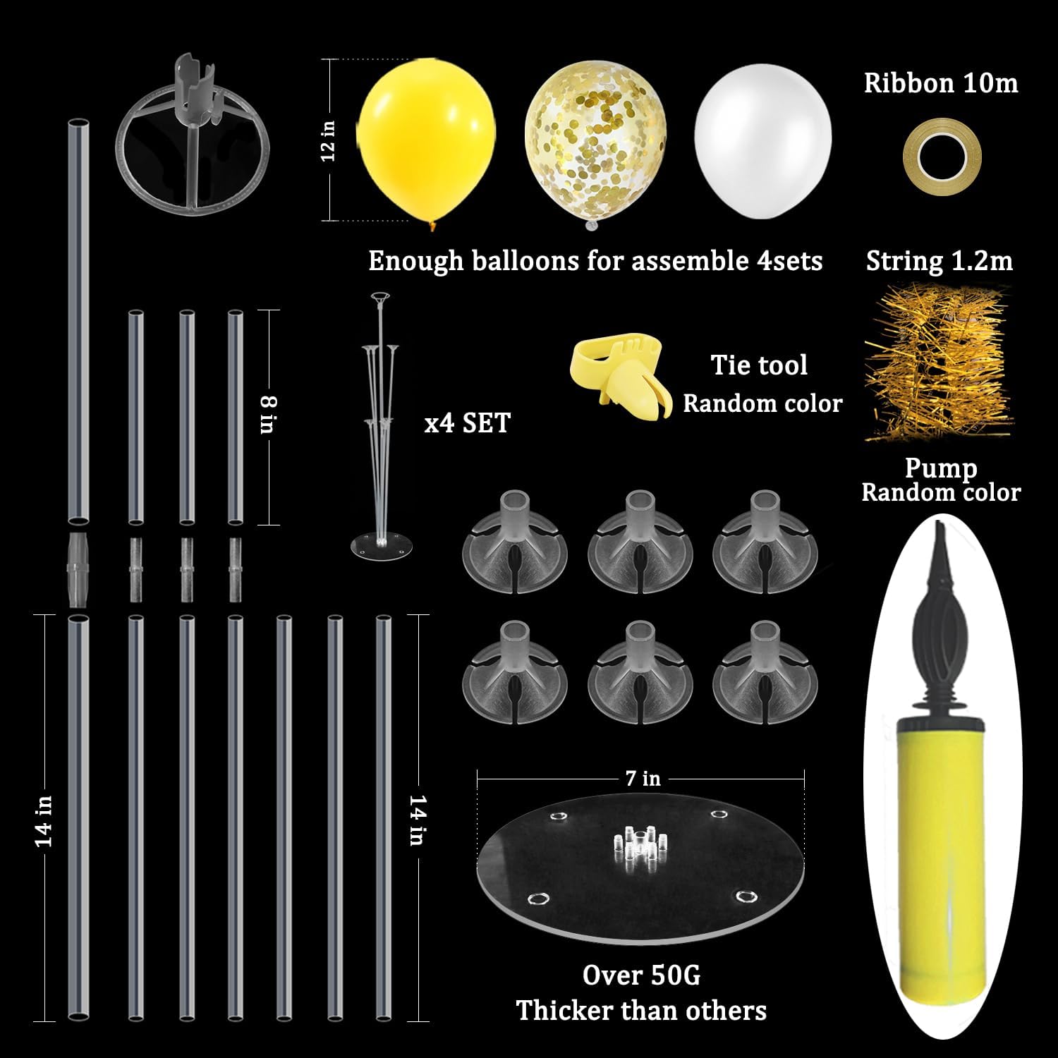 • WHAT INLCUDE: This balloon stand kit include 4 set balloon holders, 35pcs balloons - yellow white balloons and gold confetti balloons, balloon pump, ribbons, glue dots and tie tool