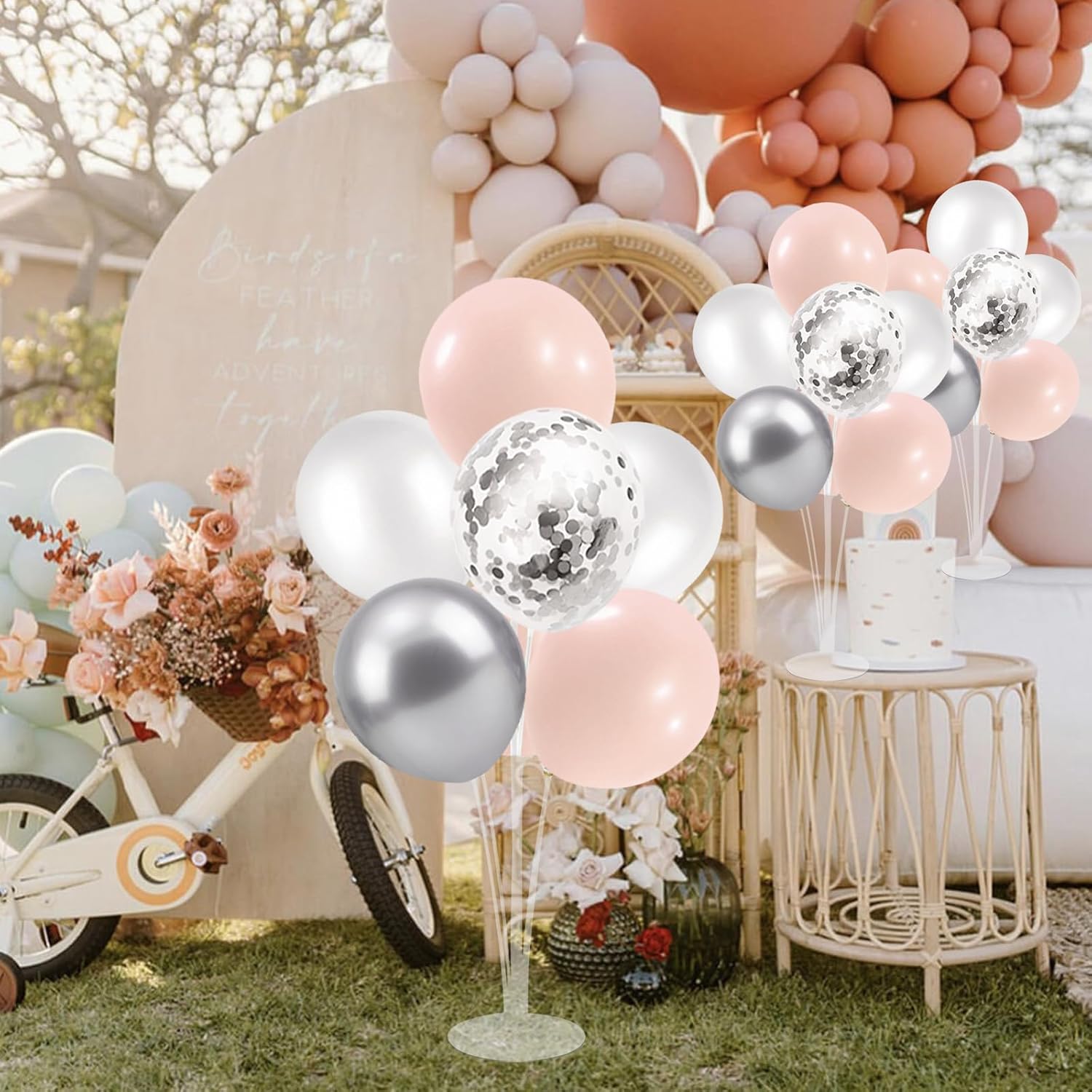 • WHAT INLCUDE: This balloon stand kit include 4 set balloon holders, 35pcs balloons - pink and white balloons, silver and silver confetti balloons, balloon pump, ribbons, glue dots and tie tool
