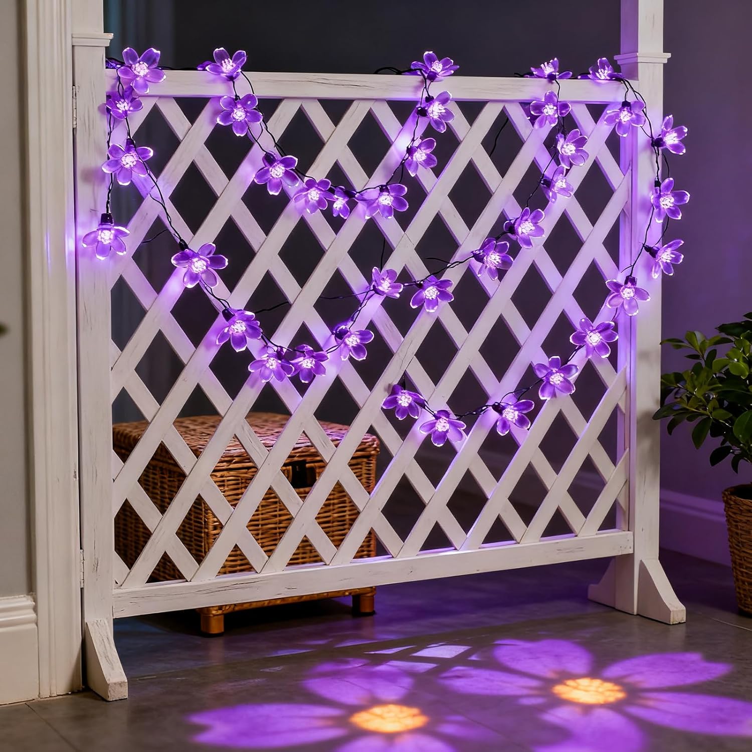• [Memory Function & 8 Flashing Modes] : The violet cherry blossom Lights string with 8 flashing changing memorized modes: Combination, In Waves, Sequential, Slogs, Chasing/Flash, Slow Fade, Twinkle/Flash, and Steady On. The string lights will begin from last set mode when you plug in next time because the memory function.