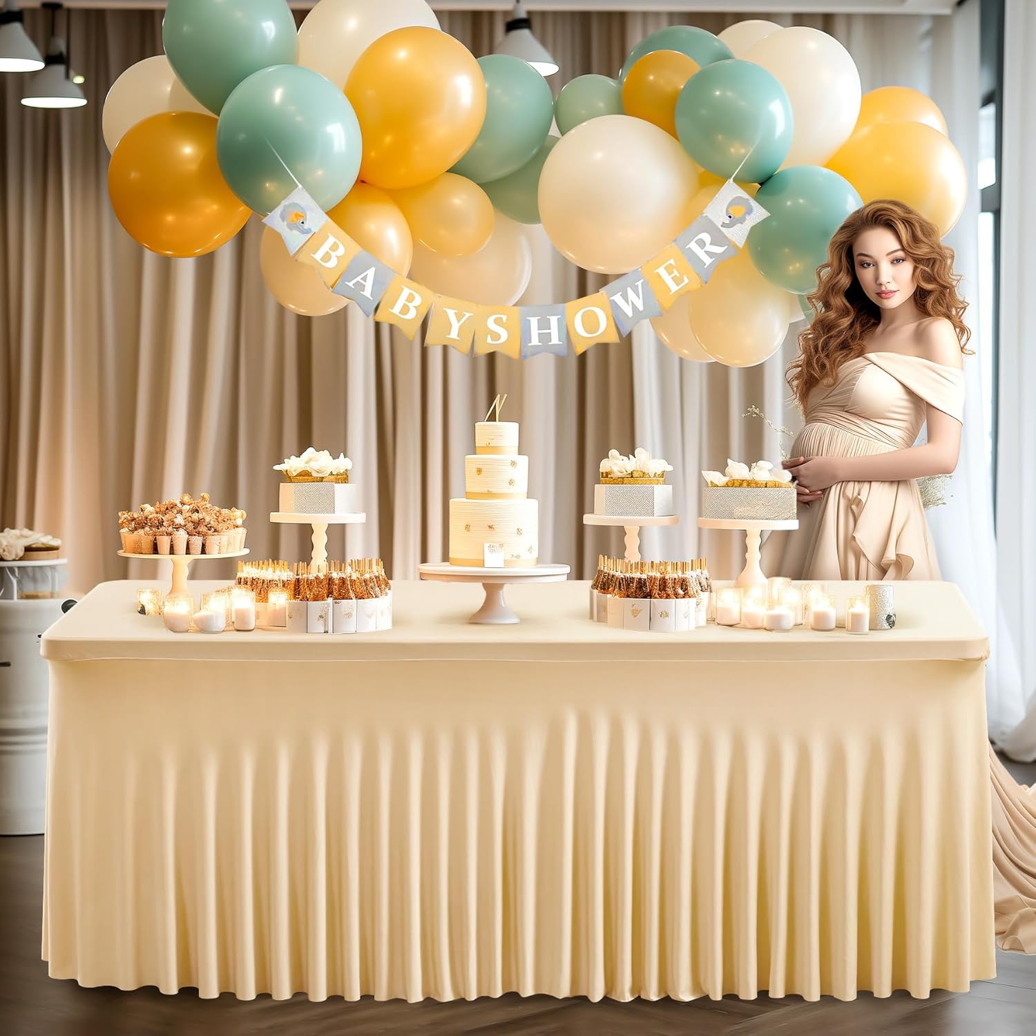 2 Pack Champagne Spandex Table Clothes for 4 Foot Rectangle Tables, 4FT Wrinkle Free Fitted Tablecloths Ruffles Design Table Cover for Party, Banquet, Wedding and Events