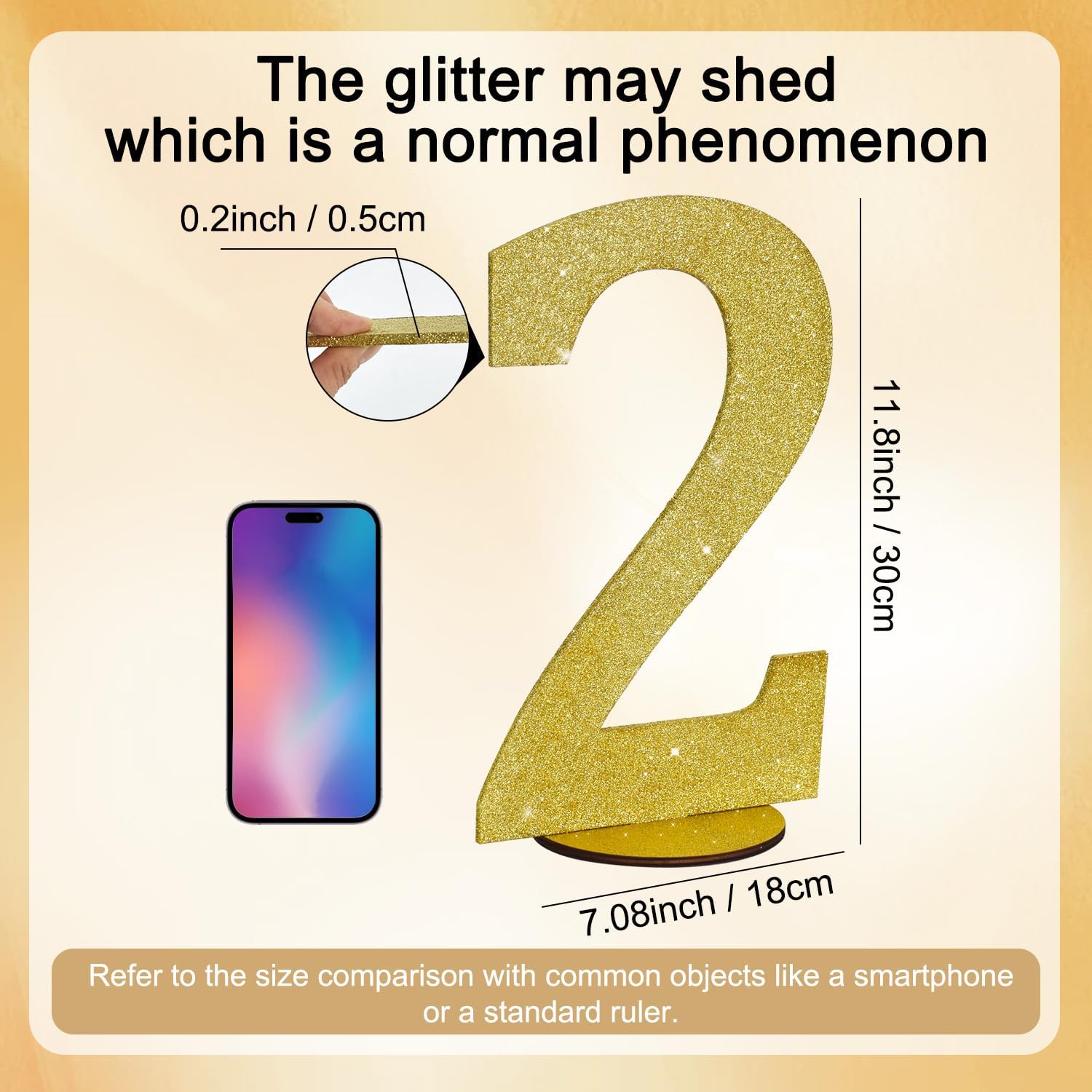 • Item Information: 1*2 gold glitter number ornament. Size: 30*20*0.3 CM (11.8 * 7.9 * 0.12 Inch)