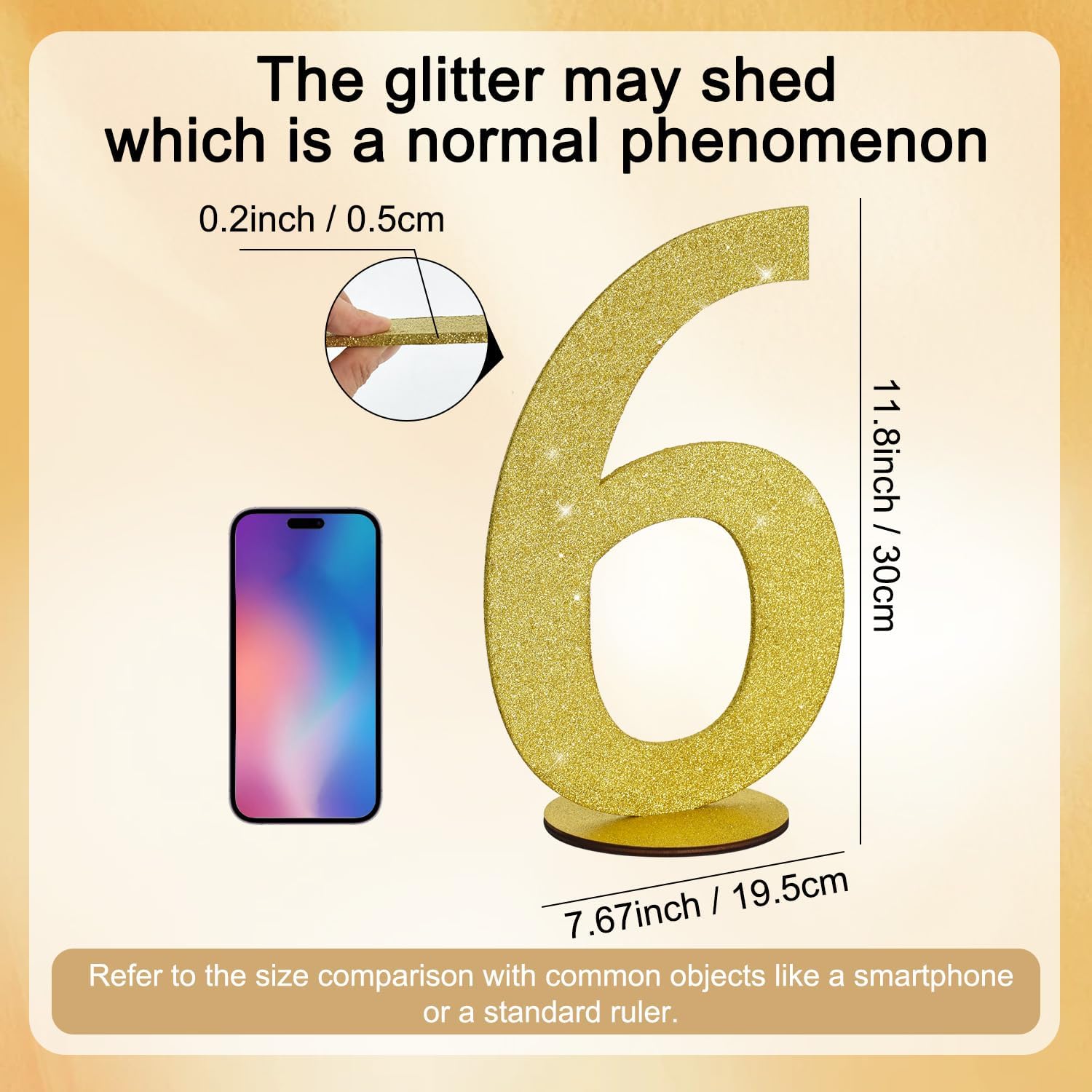 • Item Information: 1*6 gold glitter number ornament. Size: 30*20*0.3 CM (11.8 * 7.9 * 0.12 Inch)