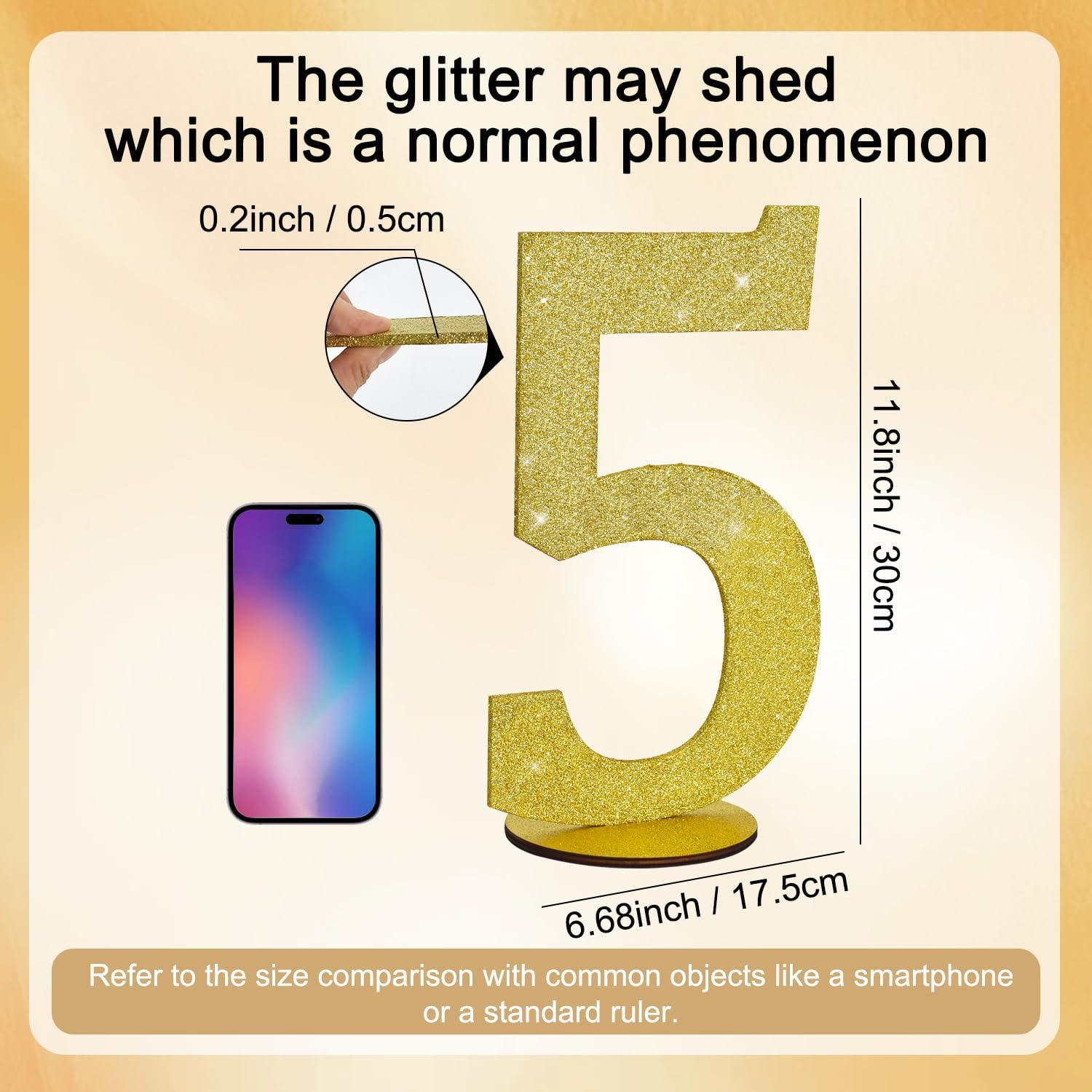 • Good Design: The appearance is adorned with fine golden glitter powder, completely surrounding the "5" wooden ornaments in every direction. When light hits it, it will reflect the light to attract everyone's attention. Makes a great party decoration