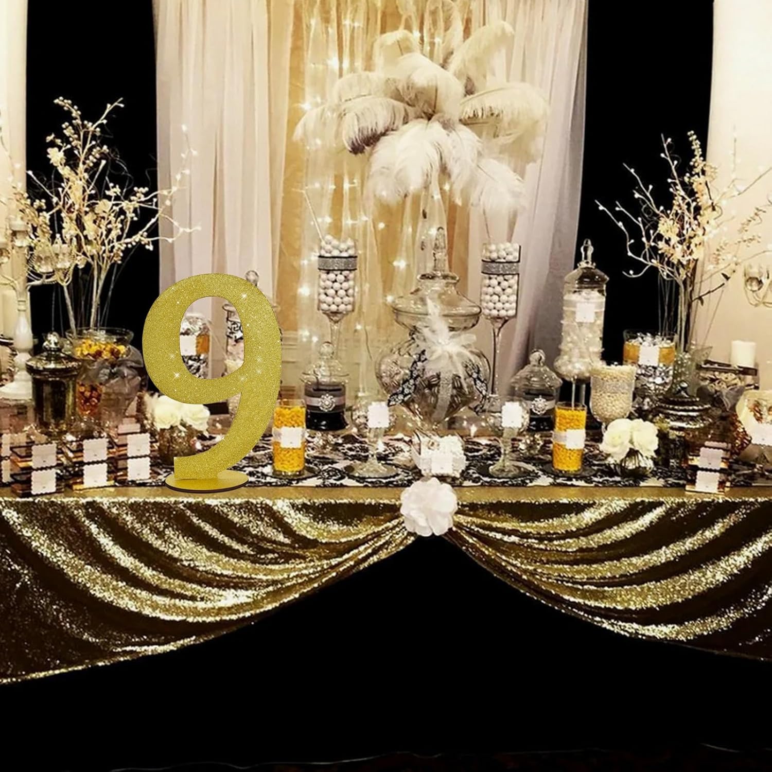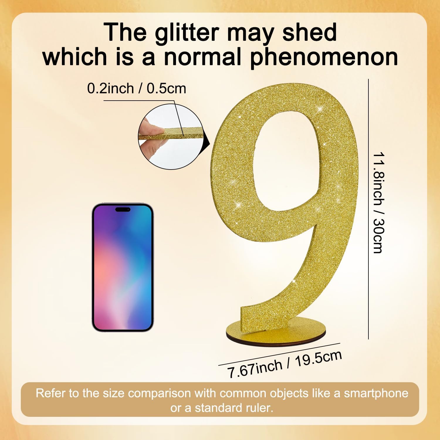 • Item Information: 1*9 gold glitter number ornament. Size: 30*20*0.3 CM (11.8 * 7.9 * 0.12 Inch)