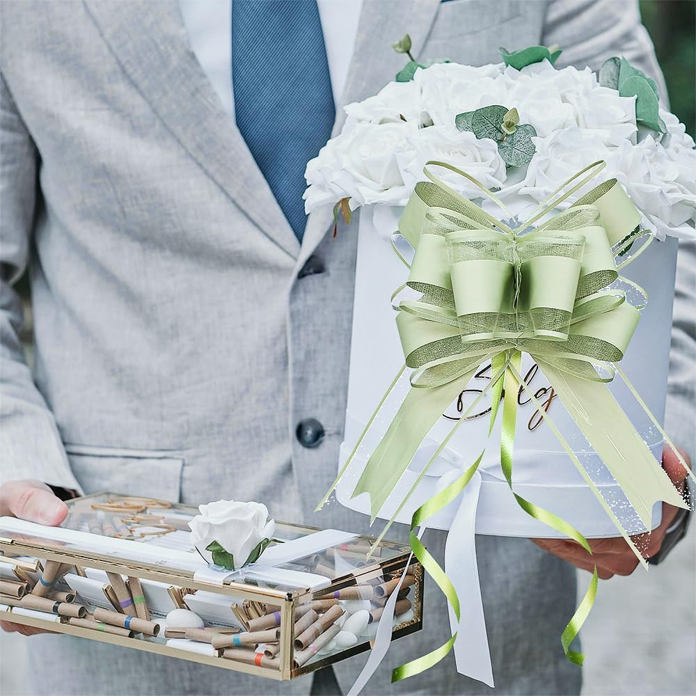 • Package: Each pack contains 15 gift bows, and their assembled diameter is 6 inches. Our Sage green bows for present are made of organza and high-quality material, and they look elegant and glamorous. Use this large bow as the finishing touch to your gift wrapping and make your gift truly stand out!