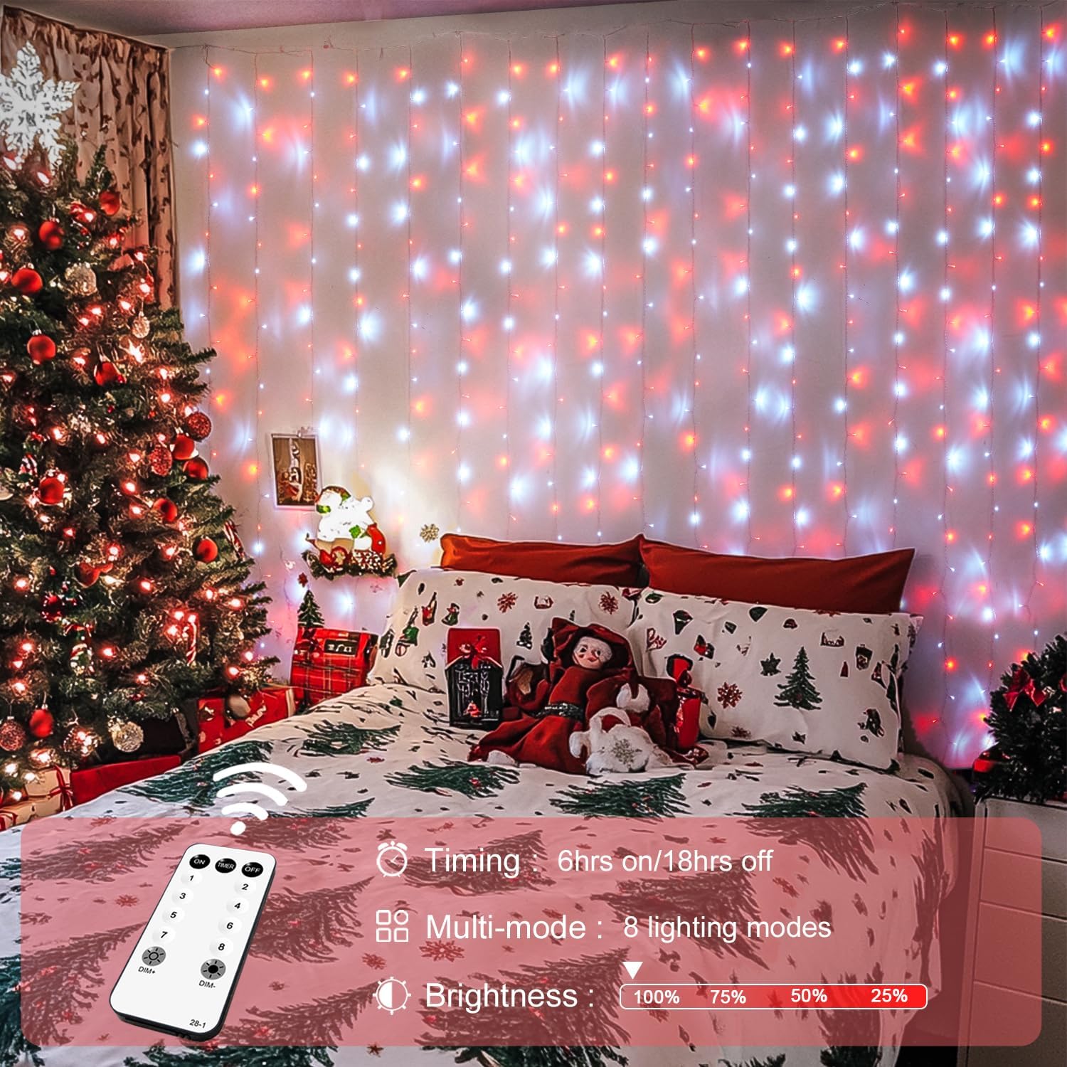• 8 SETTING MODES & REMOTE - Our Christmas wall hanging curtain lights contain 8 modes (combination, in wave, sequential, slo glo, chasing/flash, slow fade, twinkle/flash, and steady on), with these soothing or dynamic flashing rhythms that create a soft /cheerful/festival ambiance to suit different moods and occasions. The remote control also contains dimming and timing functions, which are friendly to the eyes, and you can dim the Christmas lights or turn them off from your bed with it