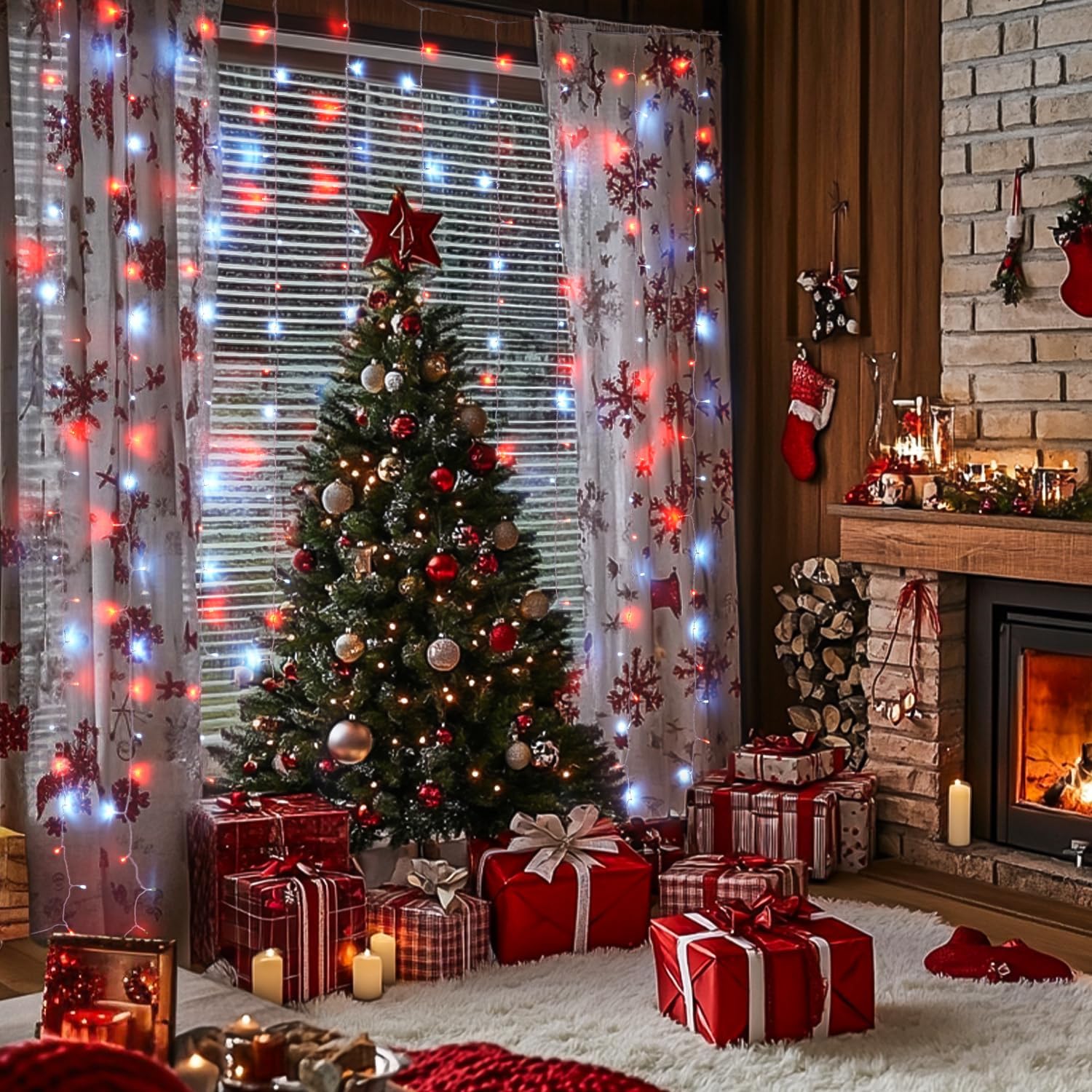 • 9.8X9.8FT RED AND WHITE CHRISTMAS CURTAIN LIGHTS - Add wonderful decorations to your Christmas event with the 300LED red and white curtain lights (UNCONNECTABLE). It comes with 10 light strands, each containing 30 pcs of LED lights. The width and height of 9.84 feet make it sufficient to cover most windows and walls for a larger light display. It gives off a glow and adds a great festival ambiance to your Christmas decorations