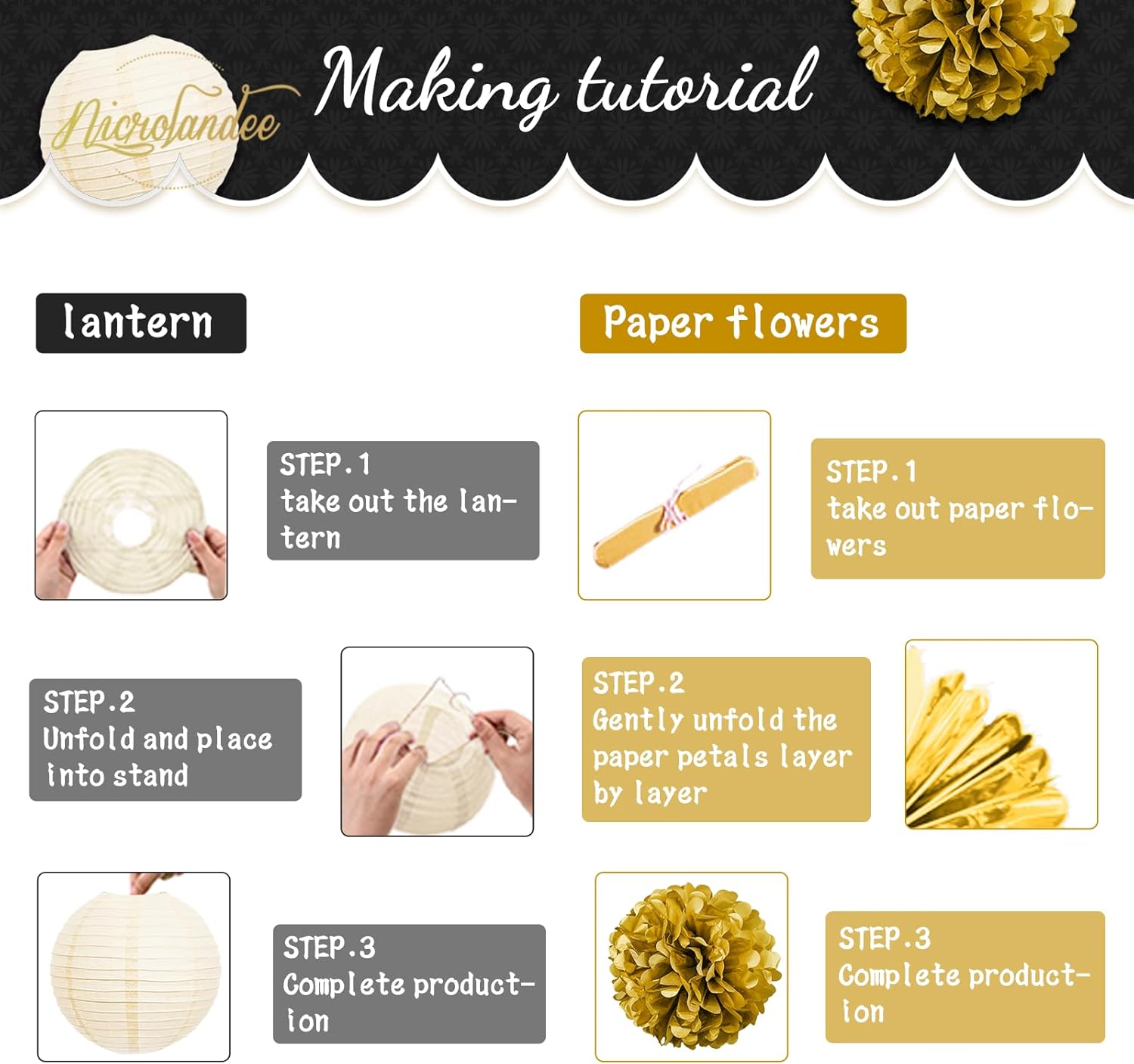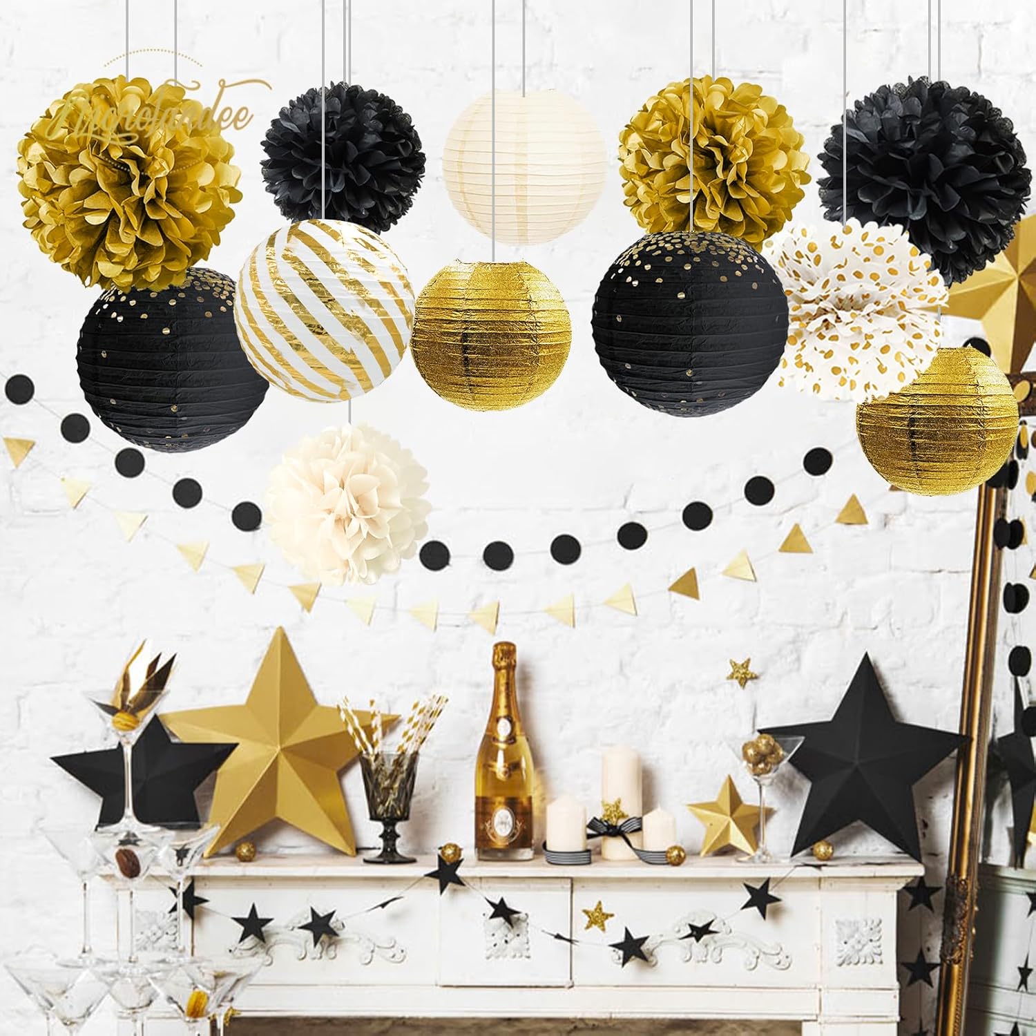 • Package Includes: Black gold decoration sets come with 5 PCS tissue paper pom poms and 7 PCS paper lanterns. Total 12 PCS party decorations kits for black gold Theme Party