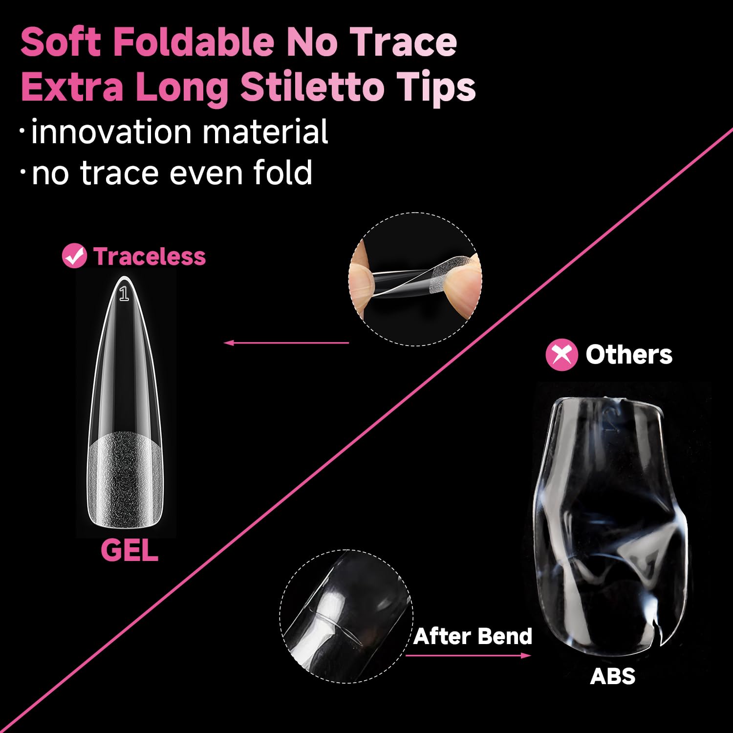• ❤️【Stiletto Nail Tips with No Trace】The clear long stiletto nail tips are gelly soft tips and will make no trace even bend, you can more easily press, trim, paint flat false nails to make your dream nails shape, such as long stiletto nail tips, medium coffin nail tips, short almond nail tips.