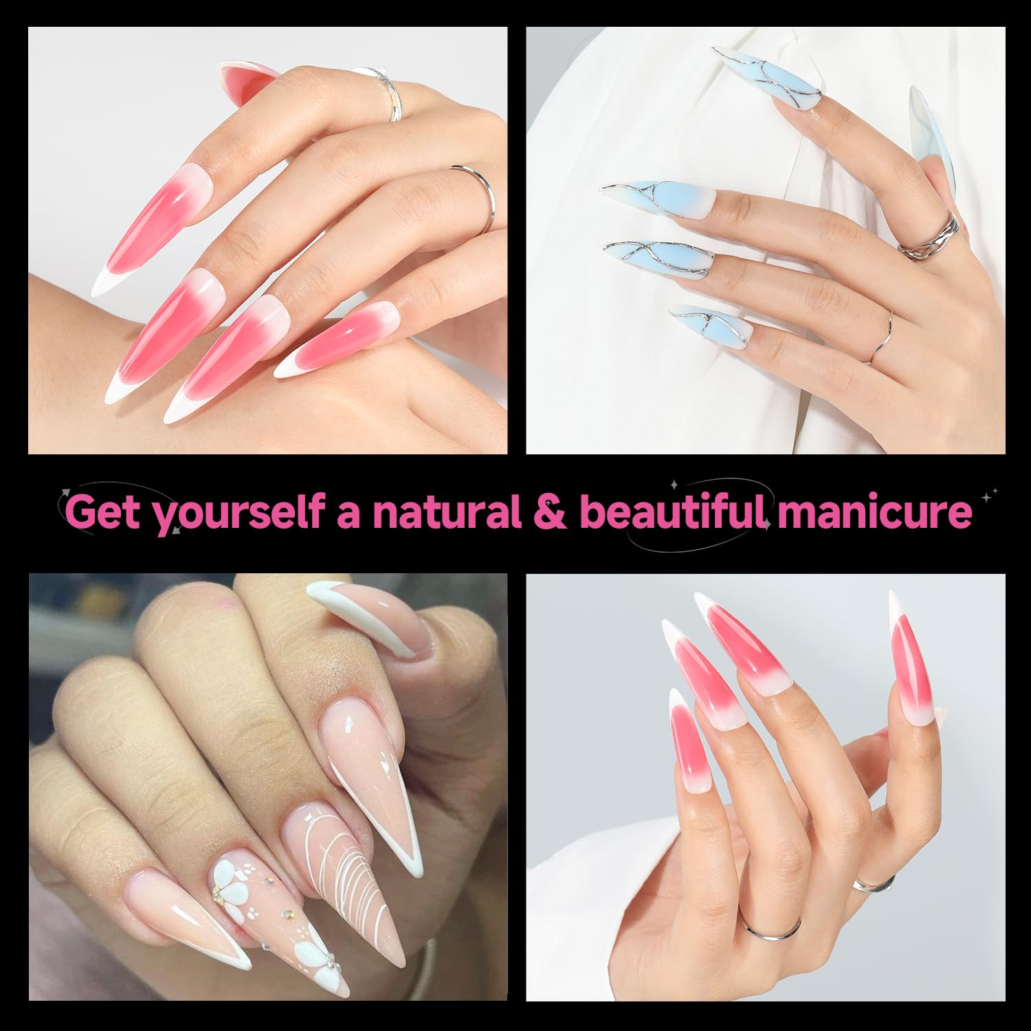 • ❤️【Natural Fit Effect】 The extra long stiletto gel nail tips feature “ Thin back edge, thick front edge”. The thinner back edge can make the full cover nail tips fit your nails better. Our tips have smooth edges with a gentler curve, making them fit comfortably against the nail bed without feeling tight. They maintain color well, don’t separate or peel, and make the nails look more natural.