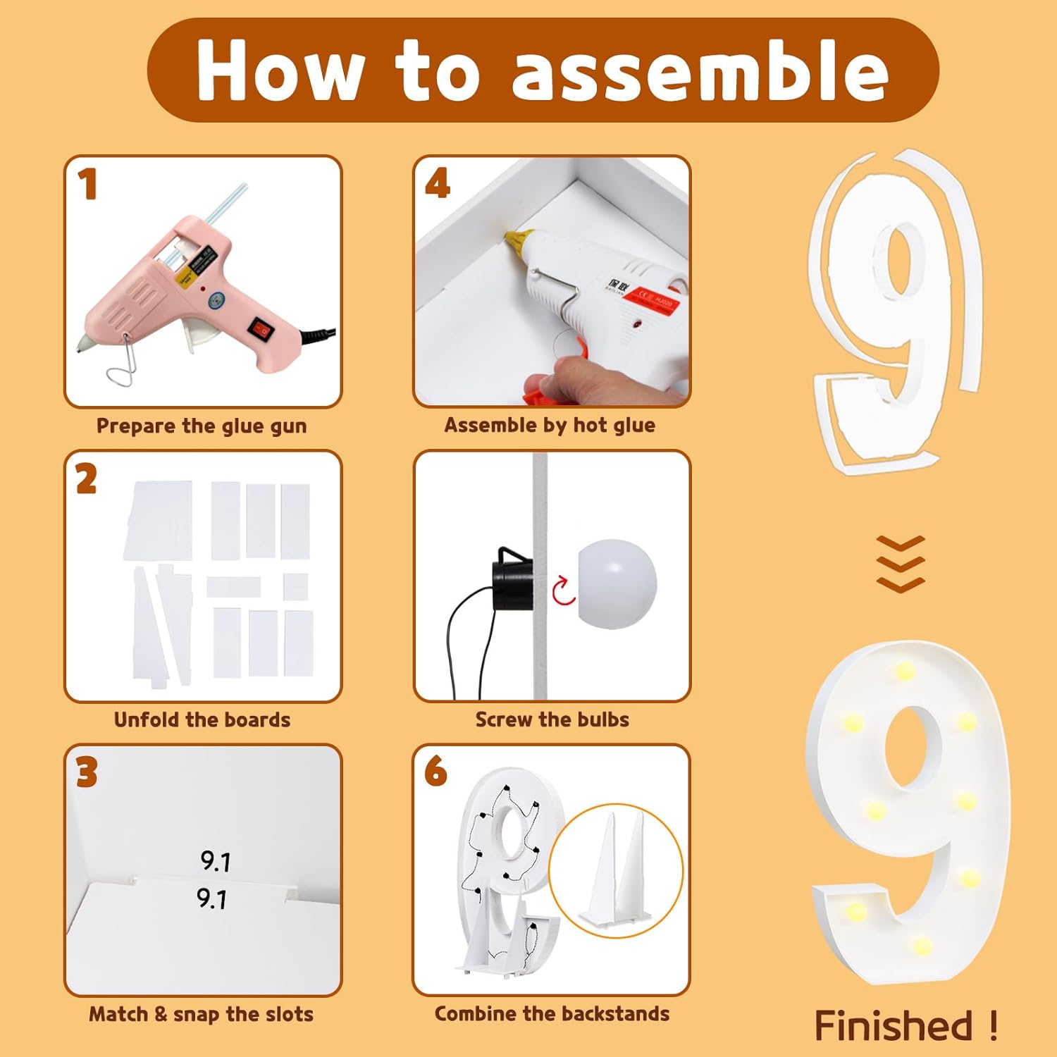 • Need to Assemble: 3 ft marquee numbers are pre-cut frame with slots, 1) Match the slots on the board and put all boards together by hot glue; 2) Screw the bulbs on the board and install 3 AA batteries