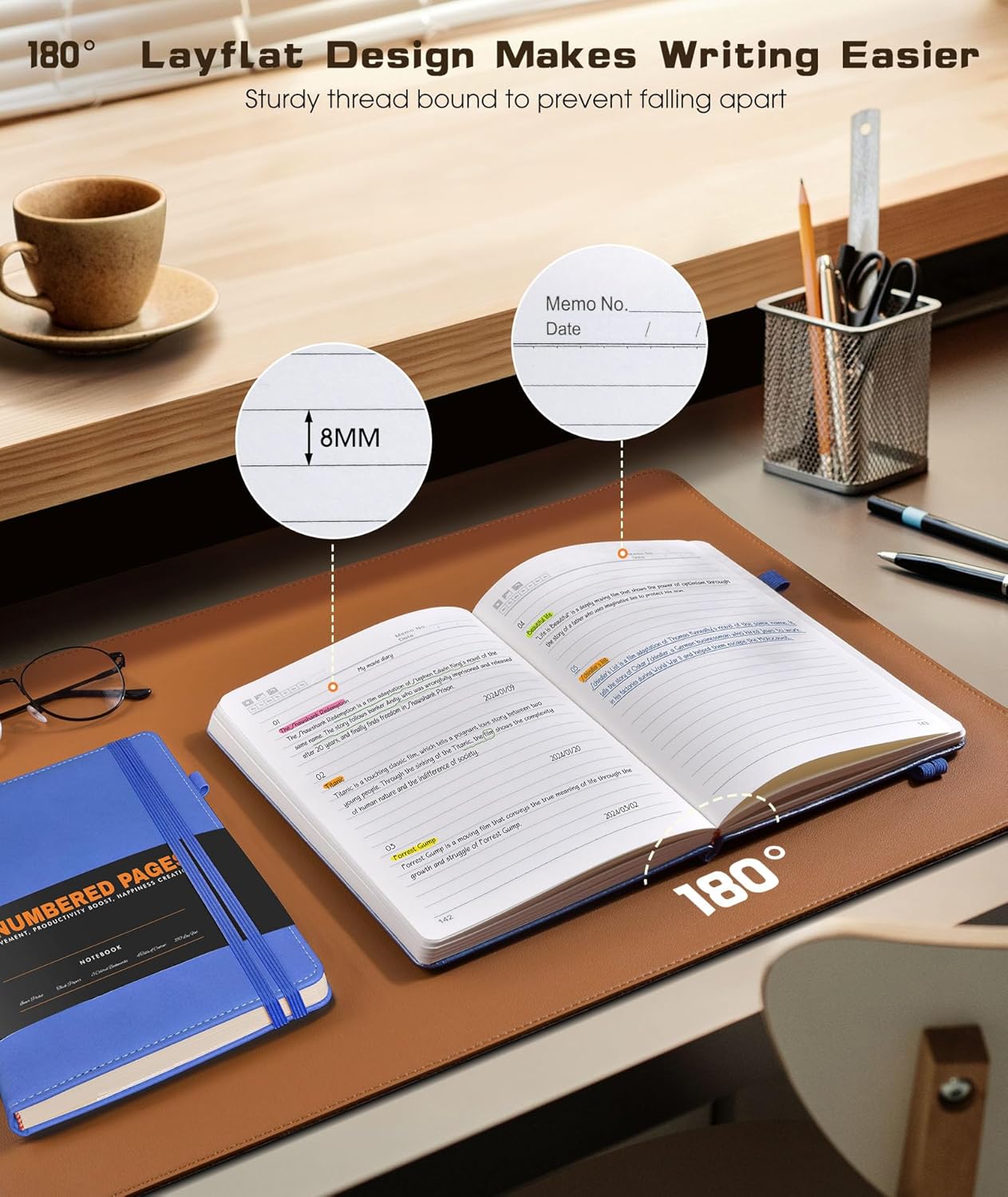 • 【180° Lay Flat Design】The 180° lay flat design, combined with a sturdy thread-bound binding, the leather notebook can easily to lay out flat makes taking notes more efficient, reading more convenient, which provide a comfortable writing experience. Rounded corner design makes the lined notebook not easy to be damaged and curled. Standard 8mm space classic college ruled journals, each journal page has “Memo No” and “Date” header to help you keep track of the date.