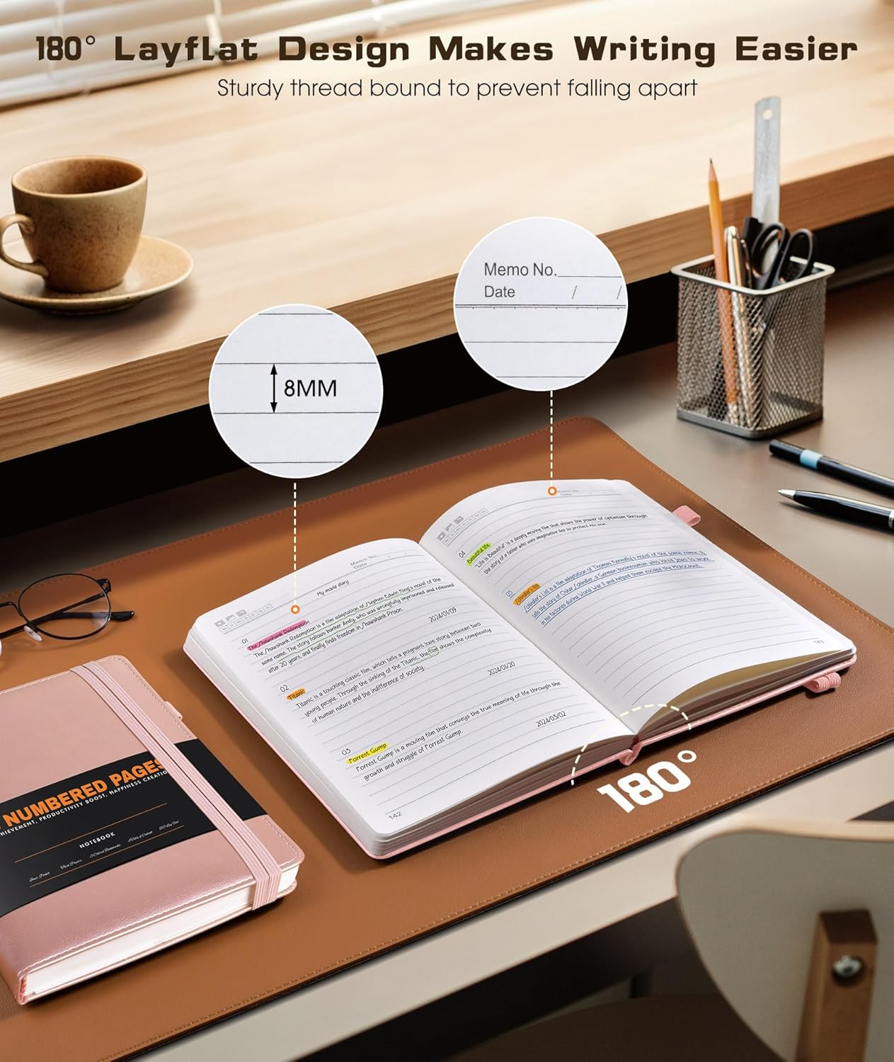 • 【180° Lay Flat Design】The 180° lay flat design, combined with a sturdy thread-bound binding, the leather notebook can easily to lay out flat makes taking notes more efficient, reading more convenient, which provide a comfortable writing experience. Rounded corner design makes the lined notebook not easy to be damaged and curled. Standard 8mm space classic college ruled journals, each journal page has “Memo No” and “Date” header to help you keep track of the date.