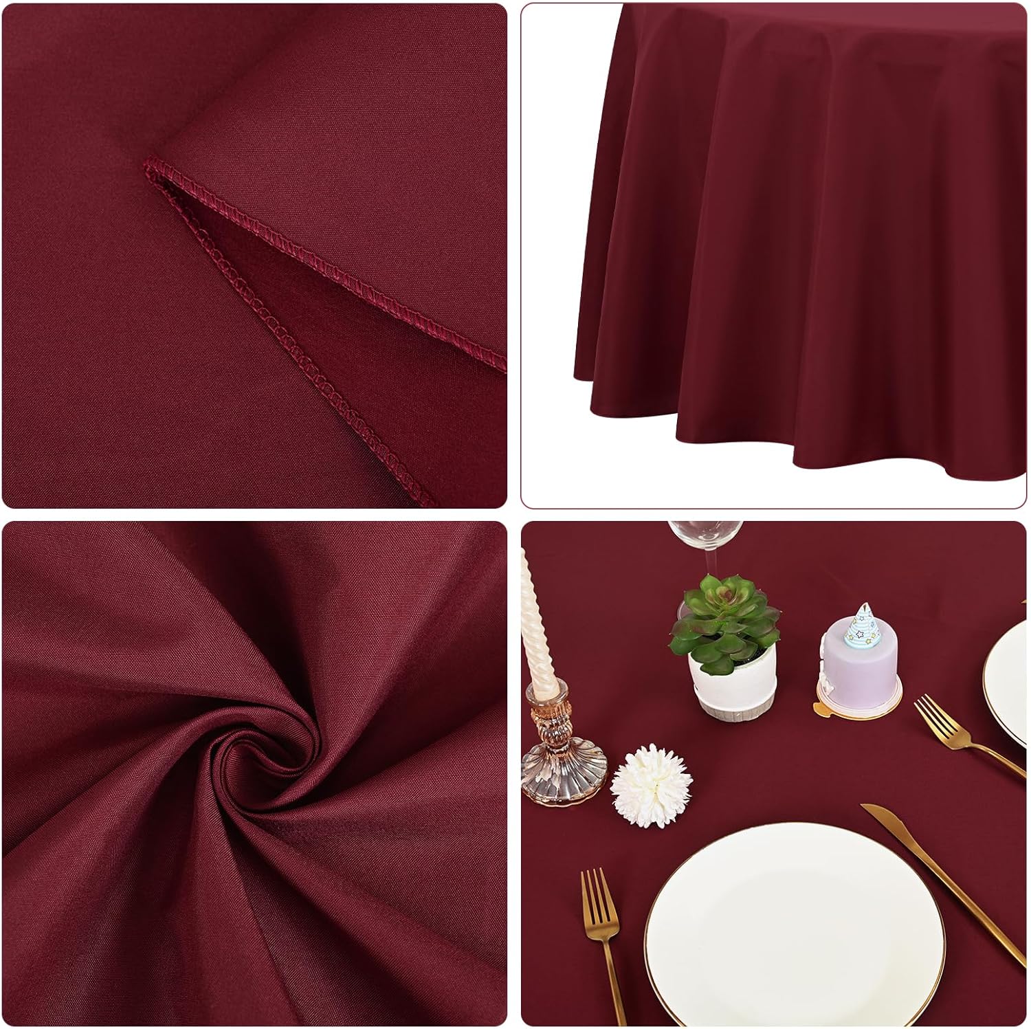 • 🍒【Size】This Burgundy polyester table cloth diameter is 90 Inch,for standard 6ft(72inch) round table, providing 9 inch drop, If your round table is 5ft(60inch), providing 15 inch drop. Please measure the size of your table before purchasing.