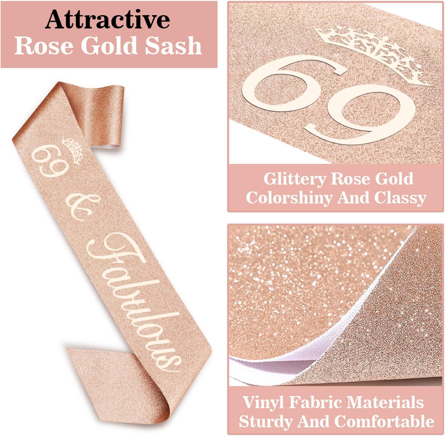 • 69th Birthday Sash for Women: Our 69 Birthday Sash is made of high quality glitter fabric with foil lettering. The sash is in 63 inch length and comes with a gold Charm Pin that you can easily adjust the length in your need