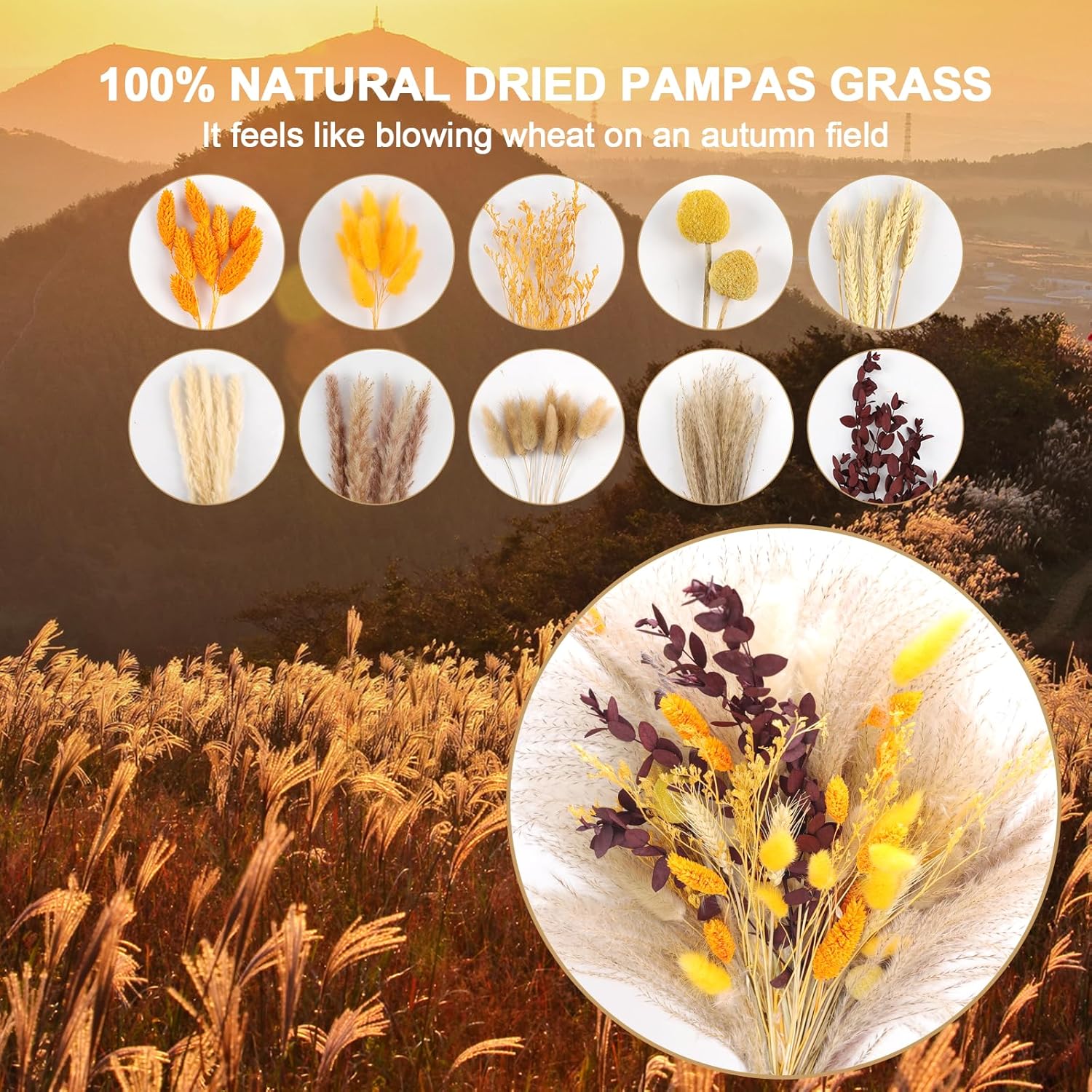 • YOU WILL GET 104PCS AUTUMN PAMPAS GRASS: Each plant is approximately 17.5in high, ten different boho style bouquets including Pampas Grass, Eucalyptus Leaves, Bunny Tail Grass and Gold Ball Grass, etc. Pure natural color small pampas grass will bring a modern touch to your home decor