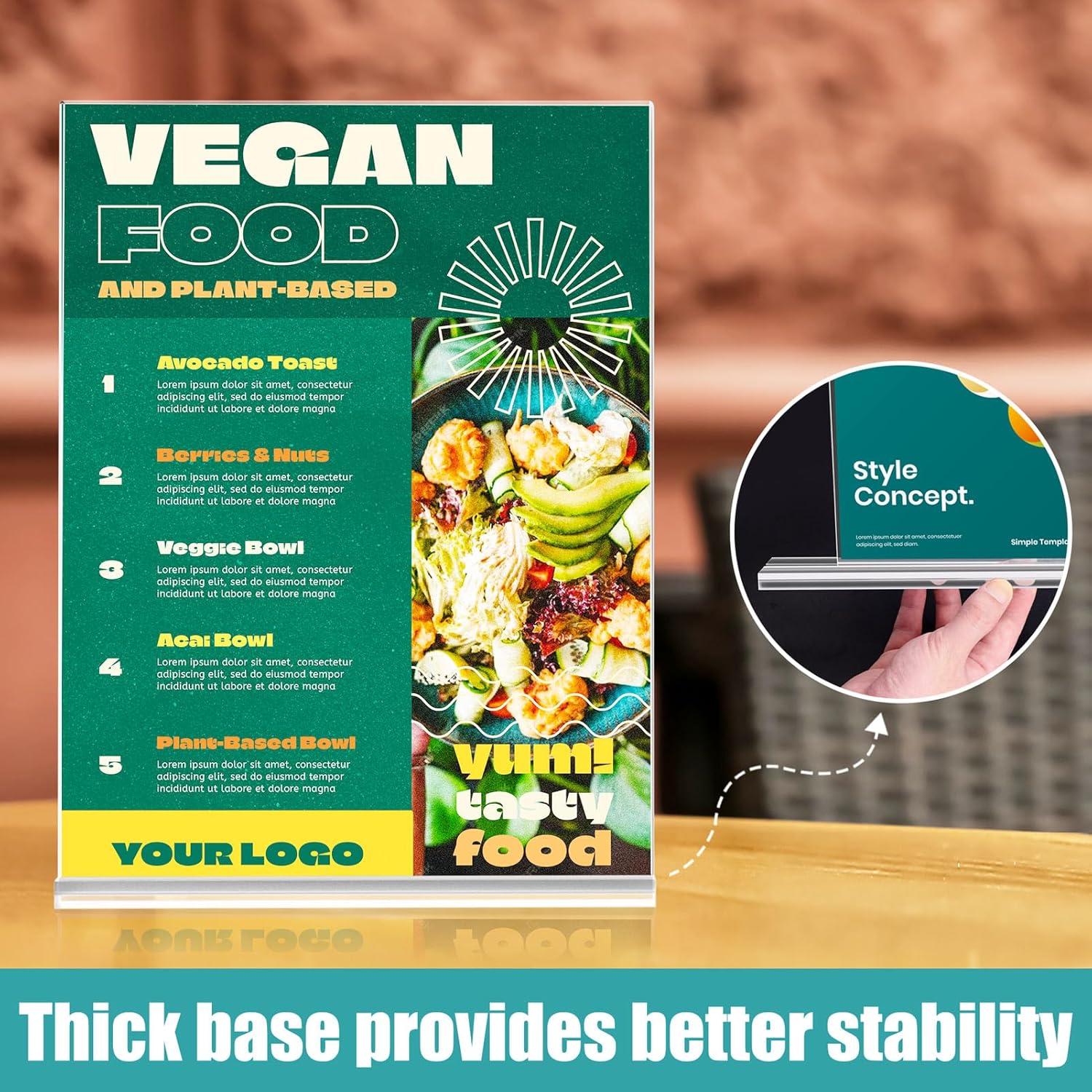 • Double-Sided Acrylic Sign Holder 8.5 x 11 inch - Clear acrylic sign holder allows your flyer to be displayed and protected on both sides, unlike slant back sign holder, which only allows you to display on one side.