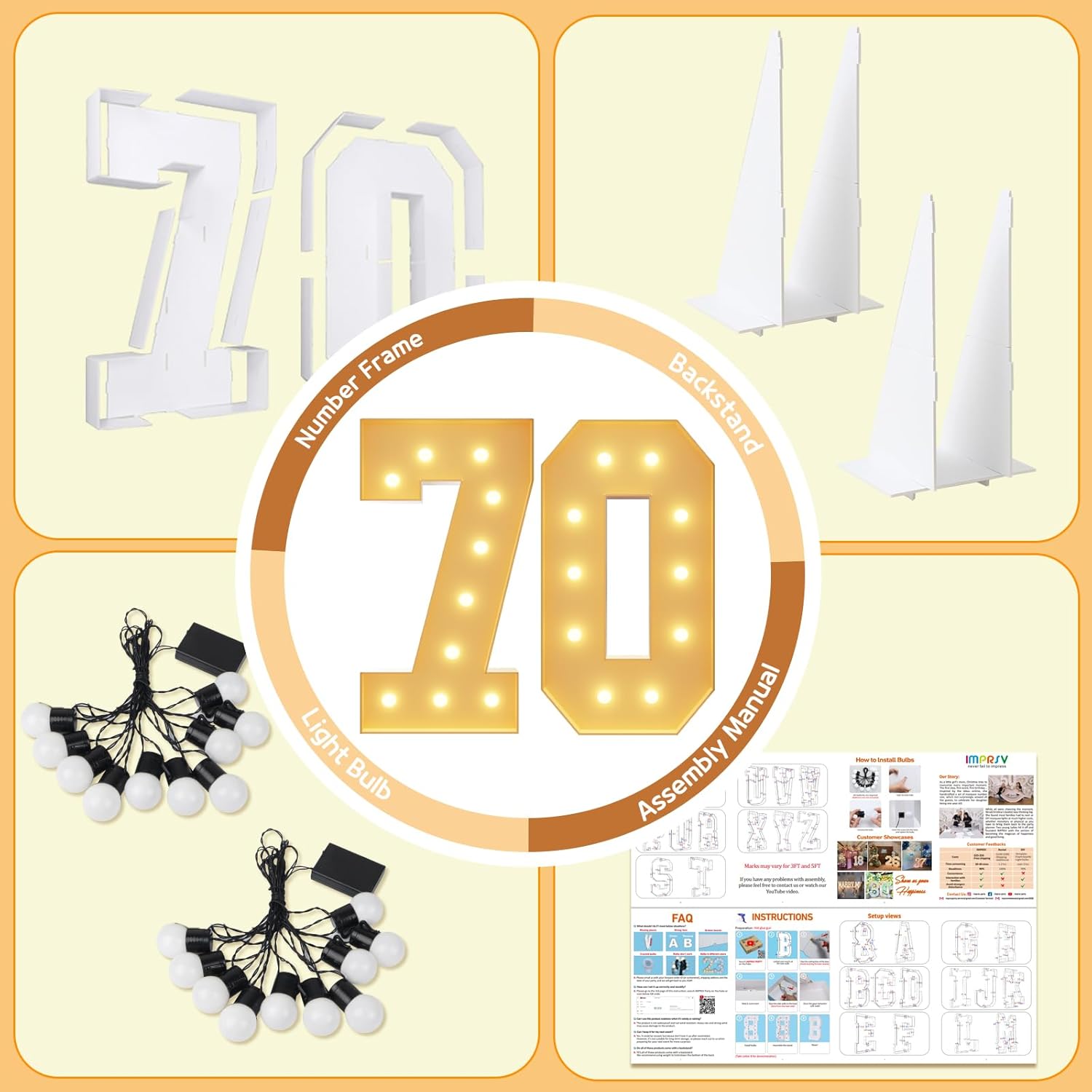 • Package Includes: A set of light up numbers for party containing the pre-cut numbers frames, a light bulb string and assembly instruction. (Noted: Glue gun and batteries are not included)