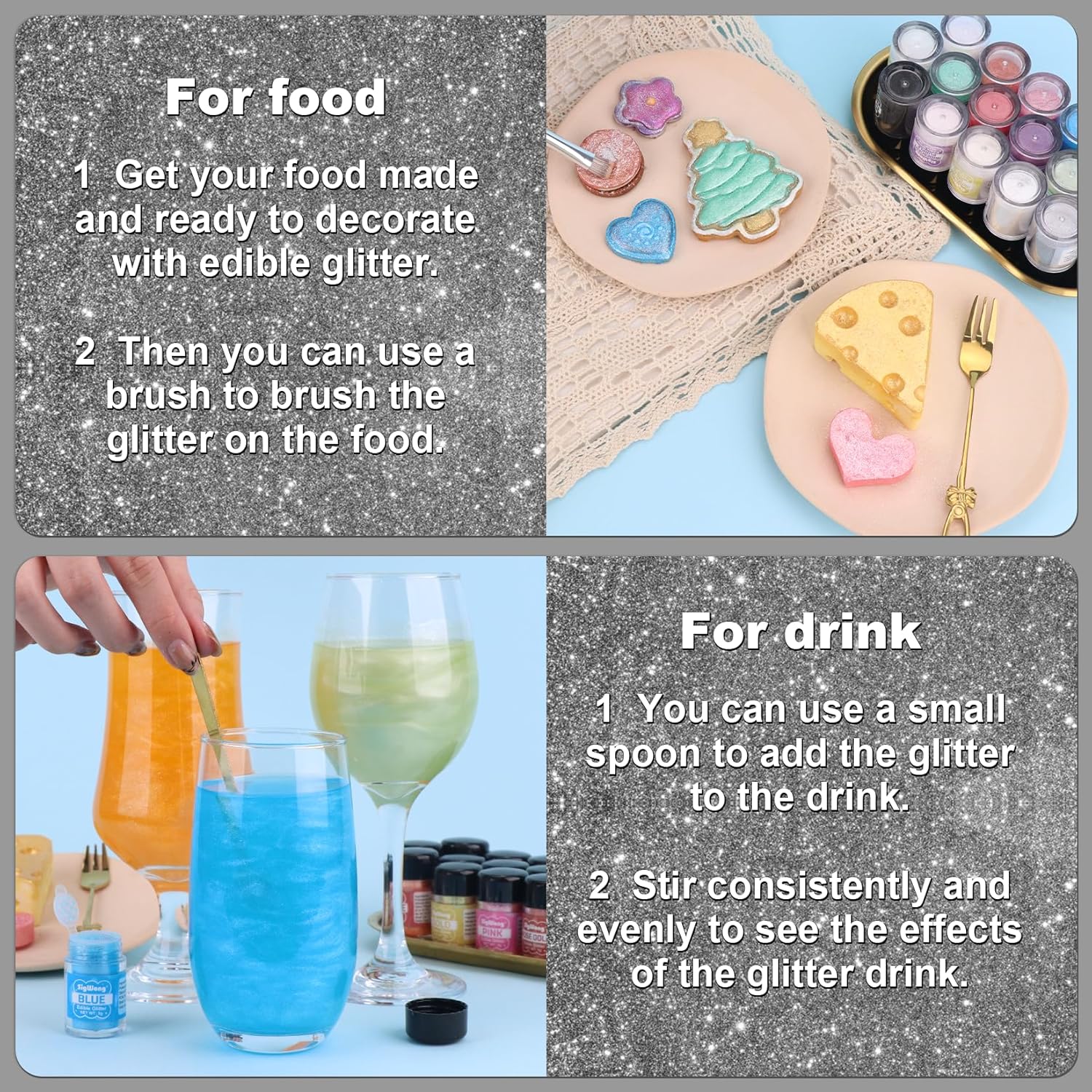 • 【Edible Glitter】: We offer edible glitter in a variety of colors, so you can match them to your party theme or personal preference to add a gorgeous shine to your drinks or baking!