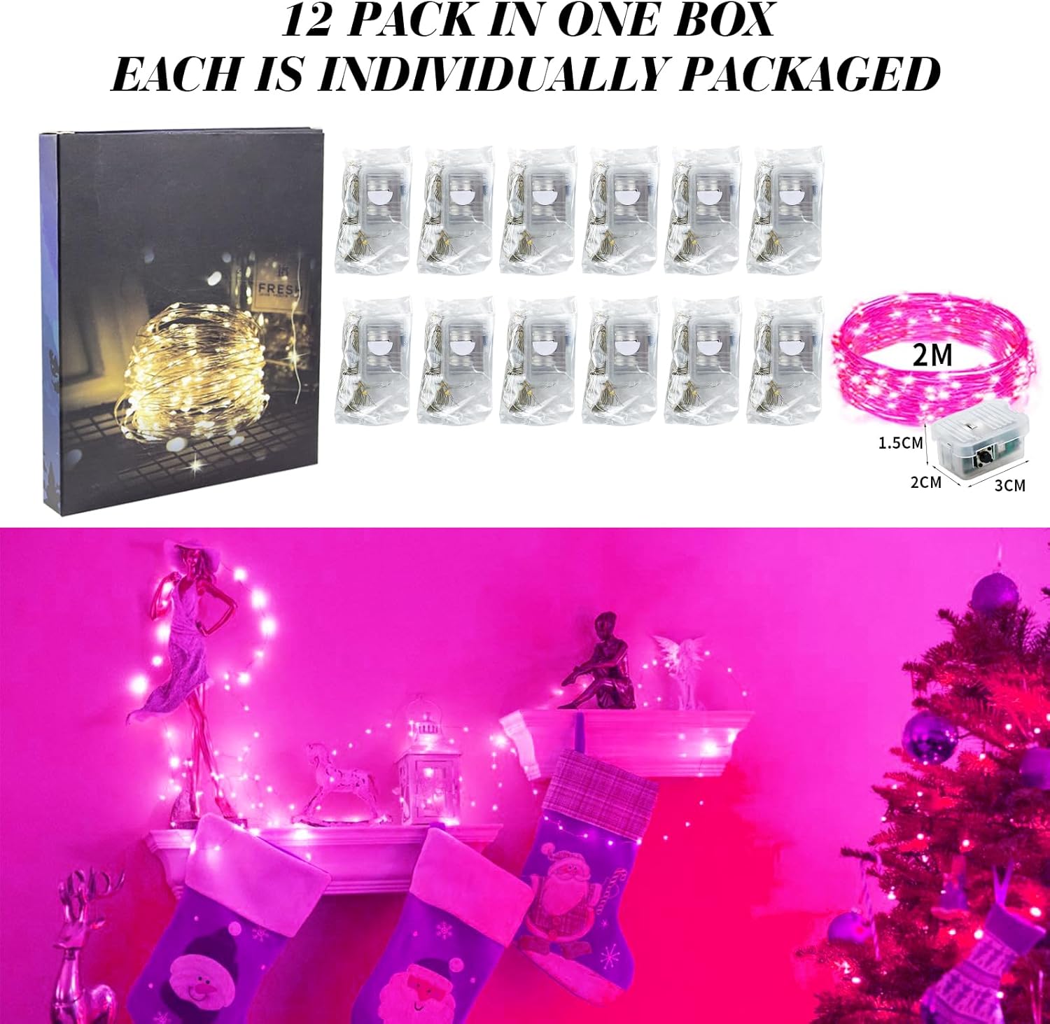 • IP65 WATERPROOF AND INDIVIDUALLY WRAP: The battery fairy lights are waterproof can be used for Indoor/Outdoor. (the battery pack is not waterproof) safe to the touch. Made of soft bendable wire so you can easily bend into any shape or wrapped it on anything such as Christmas trees, wine bottle, pumpkins, guirlande lumineuse interieure, potted landscape etc.Each light is individually packaged, say goodbye to cable tangles and bring more happiness and satisfaction to your family and friends