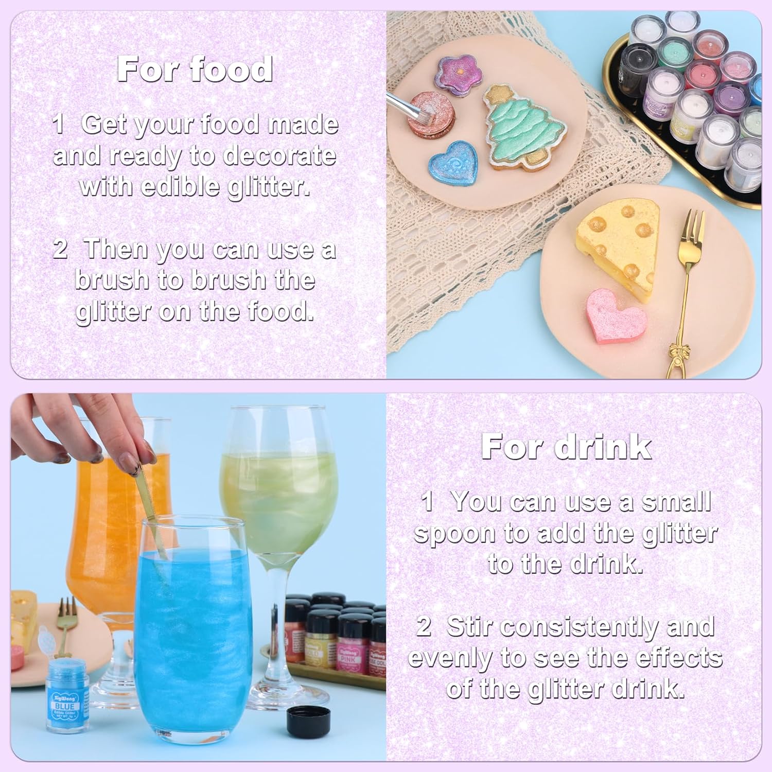 • 【Edible Glitter】: We offer edible glitter in a variety of colors, so you can match them to your party theme or personal preference to add a gorgeous shine to your drinks or baking!