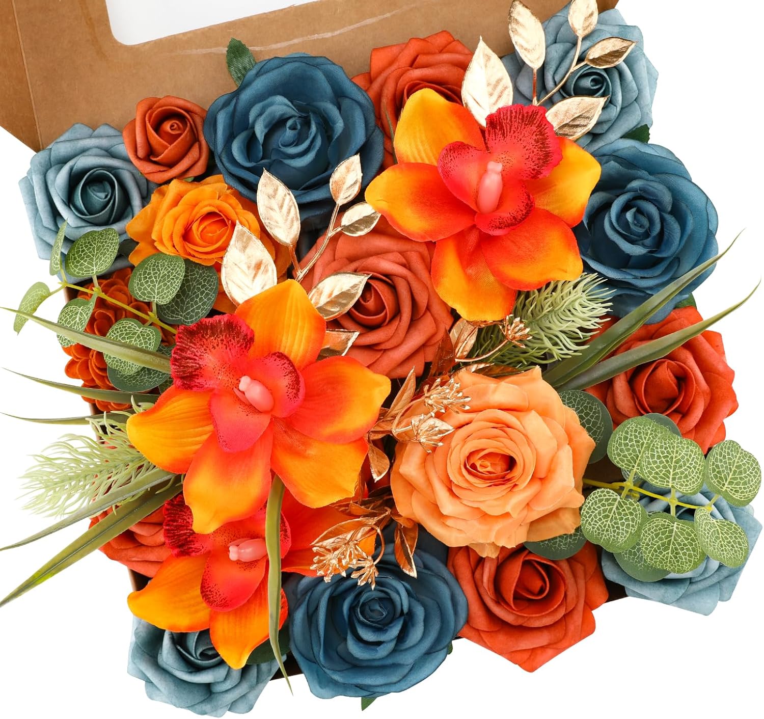 • โ™”ORANGE ARTIFICIAL FLOWERS COMBO-Floweroyal faux flower set contains roses, eucalyptus, wild flowers and other accessories. All comes in a very cute box, easy giftable item.