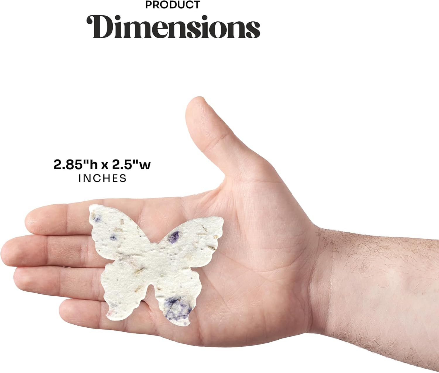 • Set of 6: Includes 6 purple butterfly seed paper, 6-mini pots with purple bows. Each heart is 2.85" x 2.5", pot is 1.5" x 2.5", ideal for pots, gardens, or outdoor spaces.
