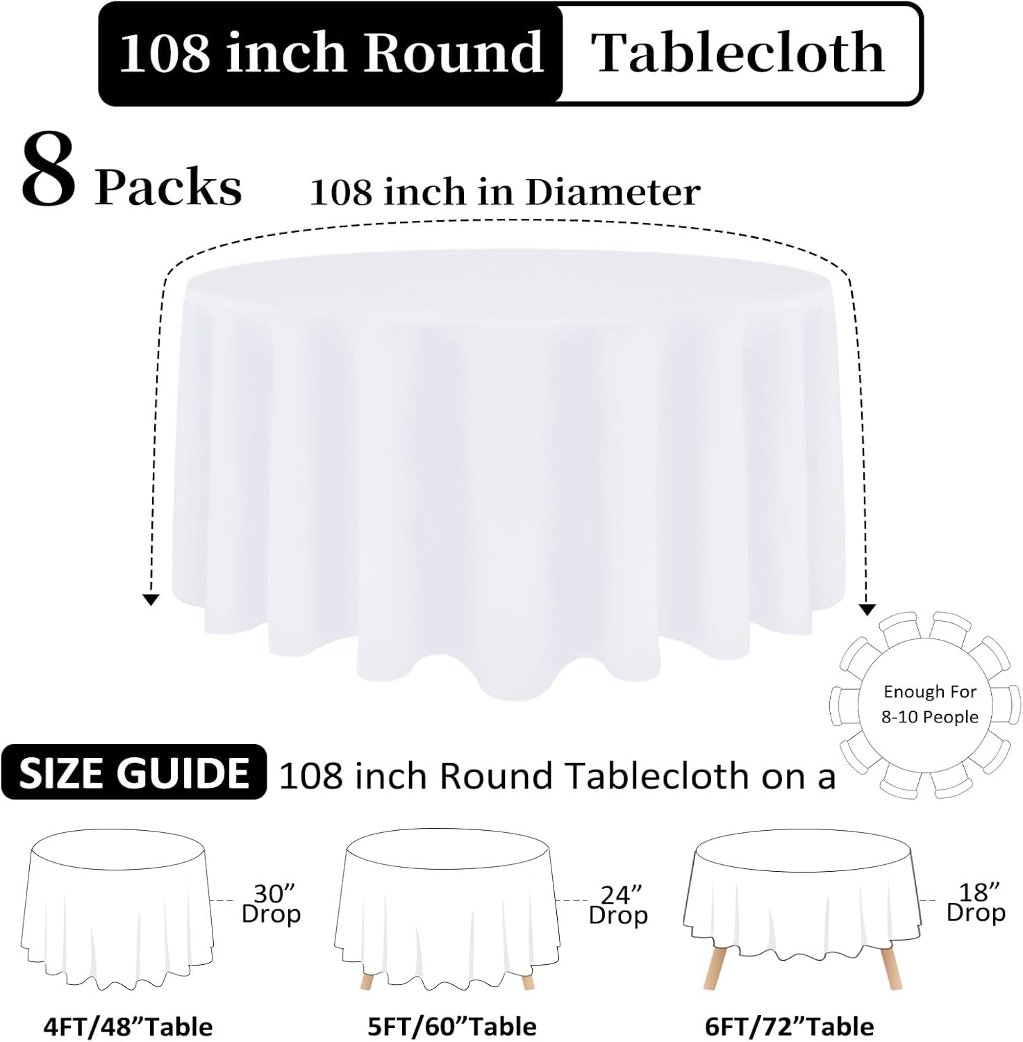8 Pack White Round Tablecloth 108 Inch White Table Cloth Stain and Wrinkle Resistant Round White Tablecloths Reusable and Washable Polyester Fabric Table Covers for Buffet Wedding Party and Banquet