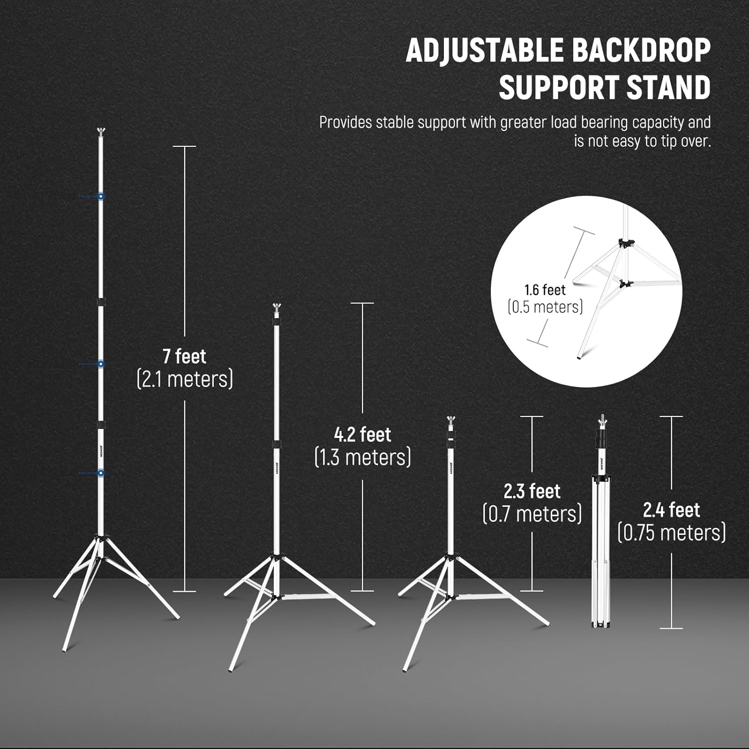 • Adjustable Height & Width: With adjustable height (2.3'-7'/70cm-2.1m) and width (5'-10'/1.5-3m), the backdrop support system holds your backdrop in place and helps you create different backgrounds for photography work