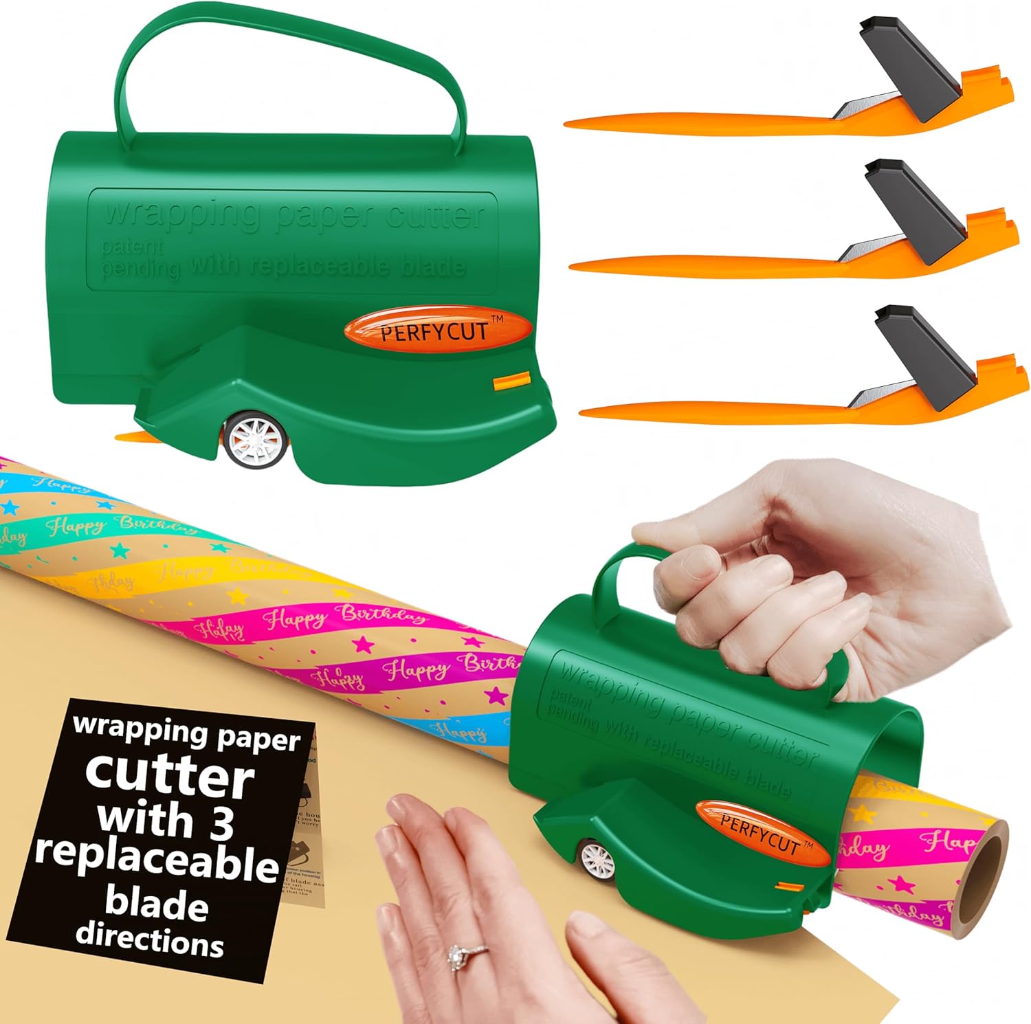 • Replaceable blade cutter - PERFYCUT patented wrapping paper cutter with 3 replaceable blade kit.Keep neat cut every time.Wrapping paper cutter with handle more easier to use.