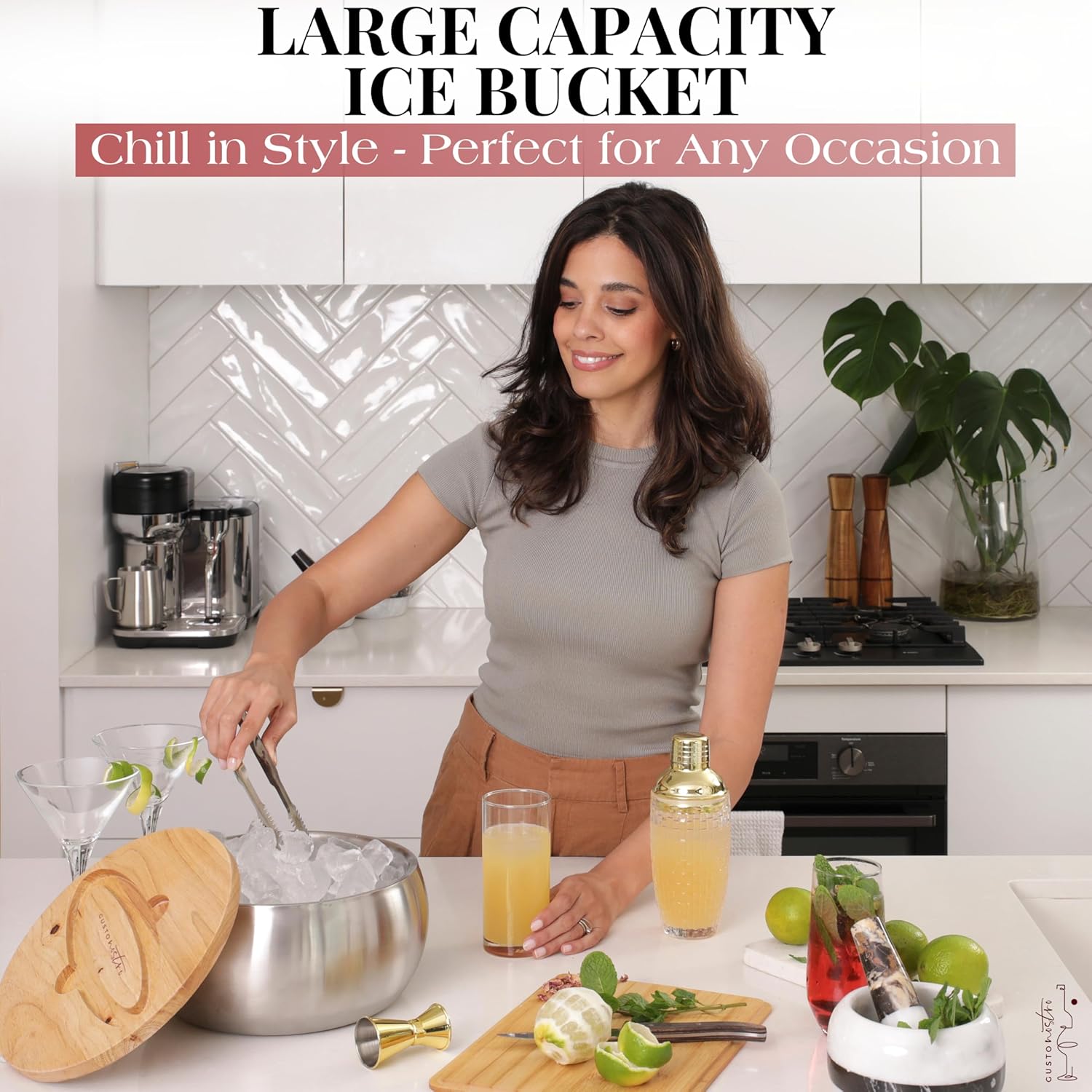 • QUALITY THAT MATTERS Stainless steel large insulated ice bucket with wooden lid and tong crafted for durability and optimal insulation, BPA-free ice bucket for bar with comfortable and ergonomic design that makes it perfect for parties and gatherings