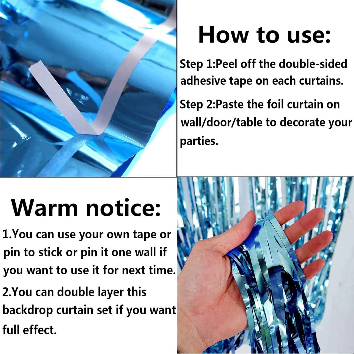 • The foil curtains good for party backdrop curtain, place on a wall and serves as a background for photos of any celebrations like: birthday party, theme party, Halloween, Christmas, New Year Eve, bachelorette party, wedding, bridal shower, baby showers, graduations and more.