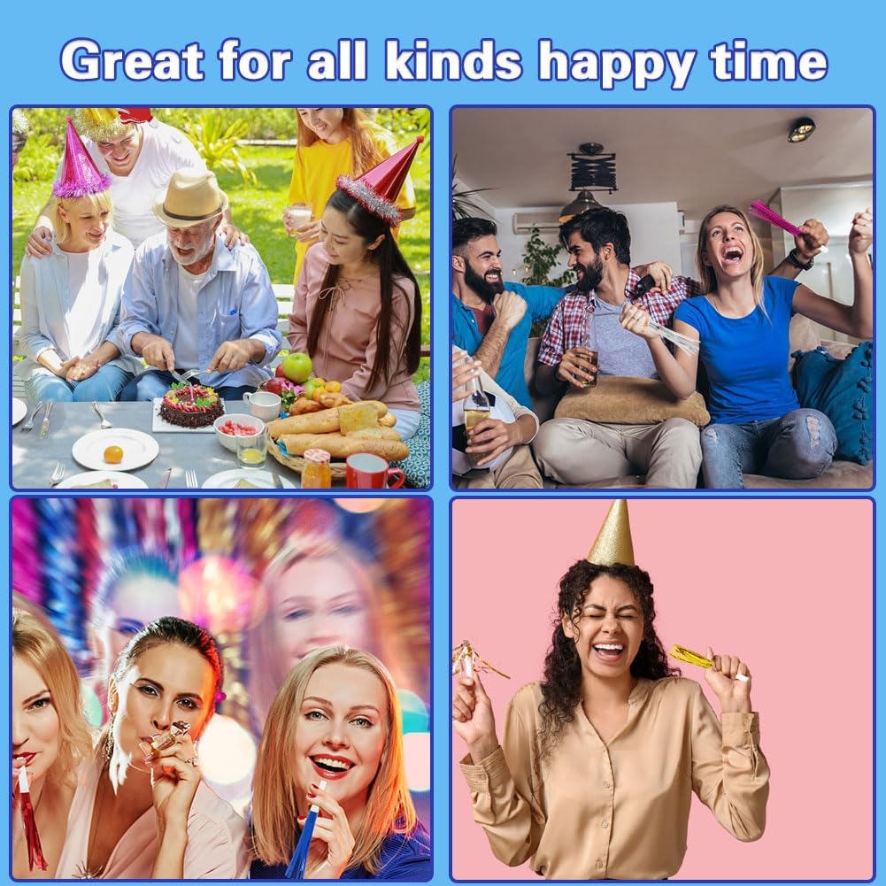 • RELIABLE MATERIAL:The blow horn noise maker is made of quality plasitc and bright foil paper; Safe with smooth surface and fine workmanship; Please gently open the packaging