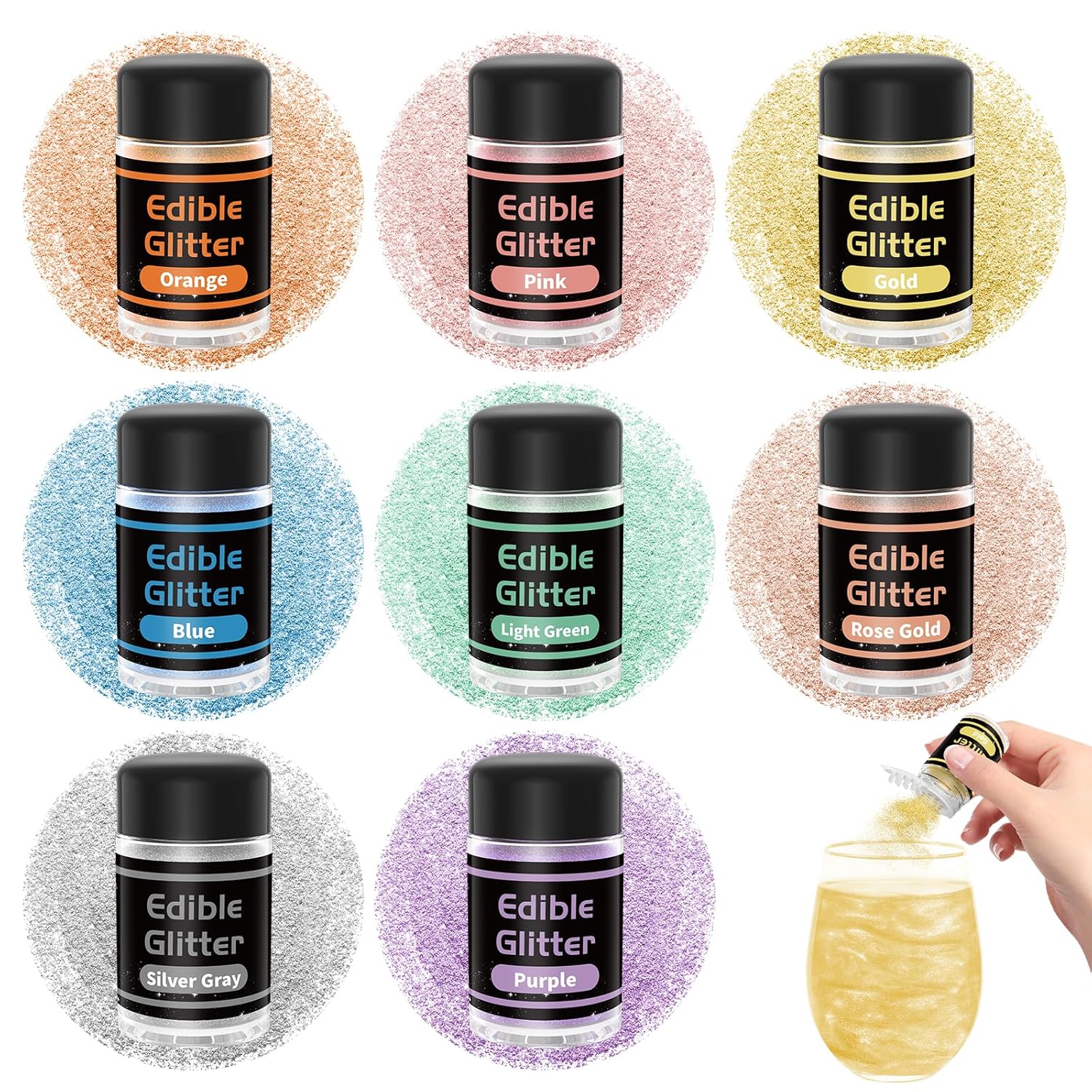 • Edible Glitter Set Contains: Light green, pink, rose gold, orange, gold, blue, purple, silver grey, 8 colors, 3 g/bottle.