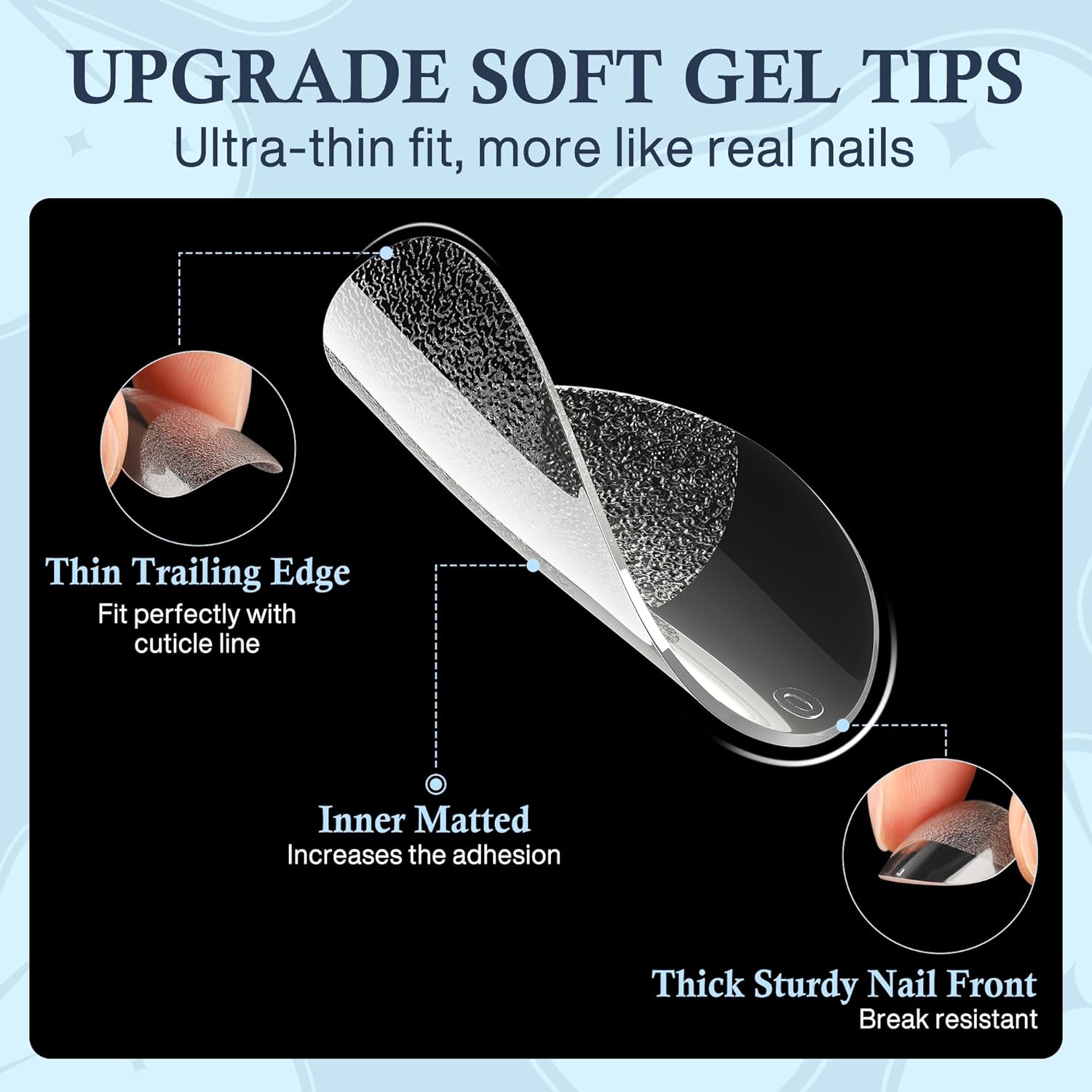 • Foldable Soft Gel Tips: Crafted from gelly soft gel material, these fake nails leave no trace even when bent. Their bright clarity allows for easy pressing, trimming, and painting, helping you create your ideal nail shape effortlessly. Perfect for a true DIY manicure.