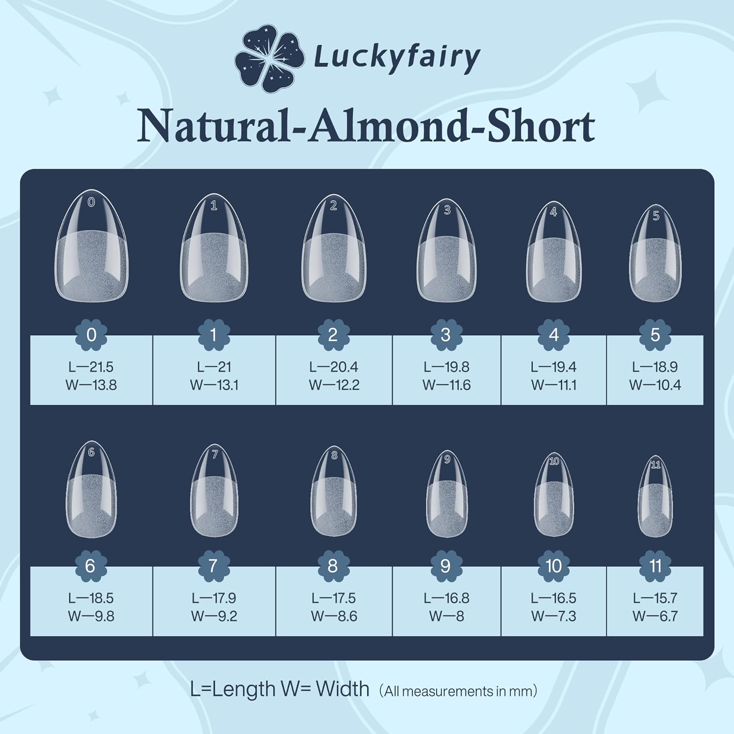 • ❤️ 12 Sizes to Fit Your Nails: Luckyfairy short almond tips come in 12 sizes, each marked with a size number for easy selection. We also include 2 extra sizes(No.0 and No.11) to ensure a perfect fit for large or small nails, providing a customized manicure experience.