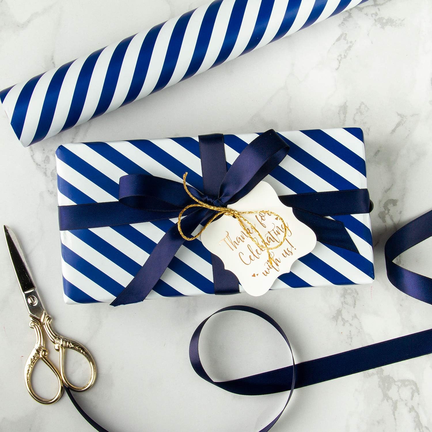 • REVERSIBLE: A solid navy side and a navy/white stripe side. Two different classic designs make beautiful and varied gift presentations easy.