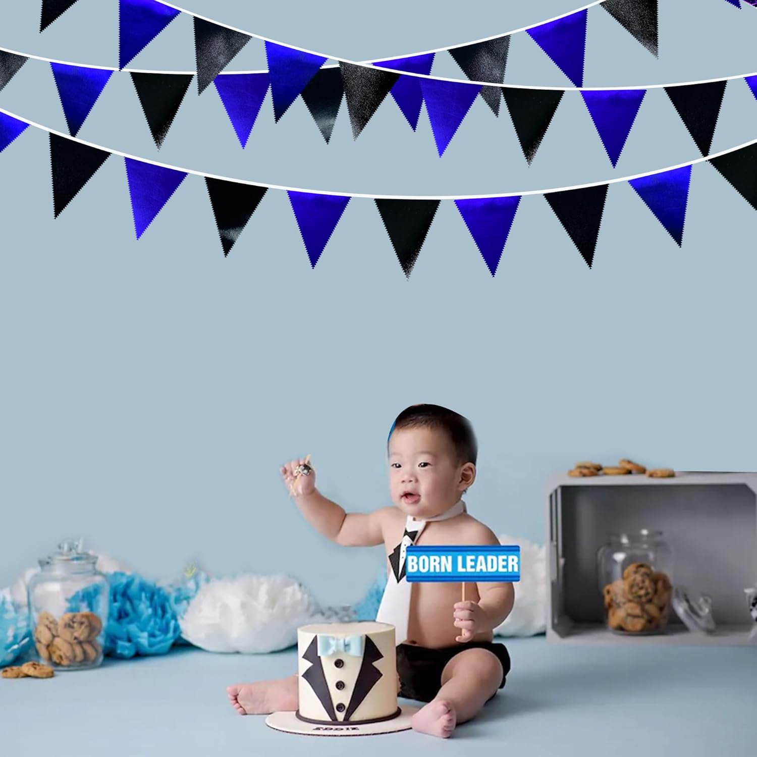 • Environmental Material - Our triangle bunting banner are made of double-sided black and royal blue metallic fabric cloth,Unique wavy neat cut,soft and comfortable touch.safe and odorless,washable and waterproof,durable and reusable.