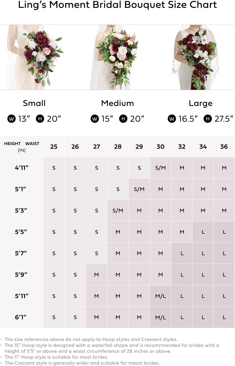 • Size: This Burgundy Wedding Bouquets for Bride is approx. [13 inches W x 20 inches H]. With ribbons card. This size is typically suitable for most brides to carry, this one is recommend for 4'11"-6'1"height and 25" waist, 4'11"-6'1"height and 26" waist, 4'11"-5'7"height and 27" waist, 4'11"-5'3"height and 28" waist, 4'11"-5'1"height and 29" waist, 4'11"height and 30" waist.