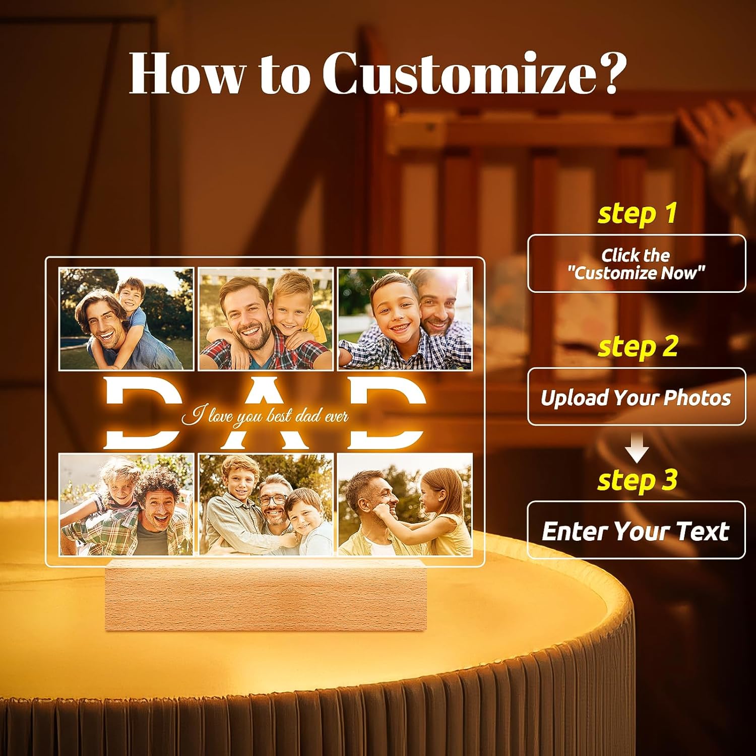 Personalized Birthday Gifts for Dad from Daughter Son, Custom Picture Frames with Photos, Customized Photo Frame with Night Light, Personalized Photo Gifts for Dad Baby Kid Family