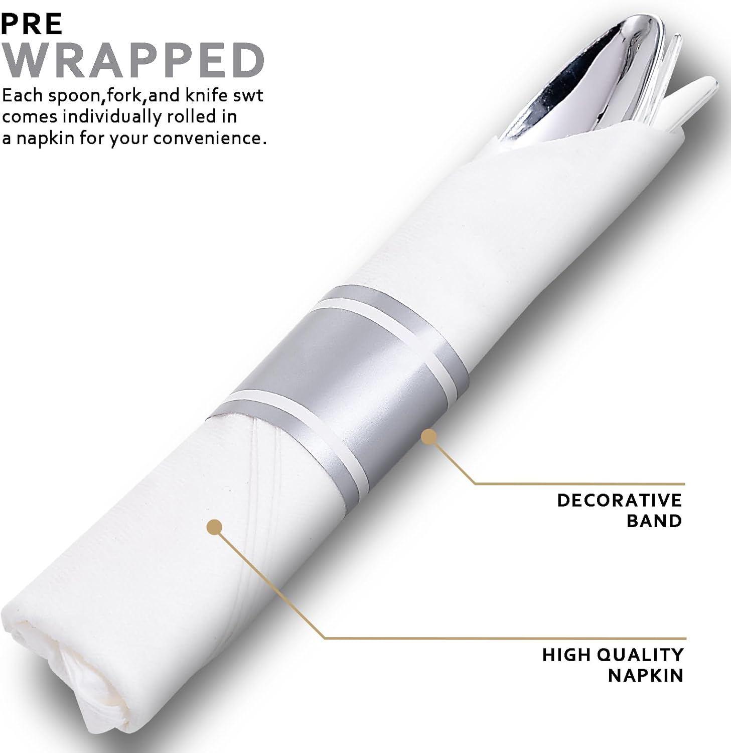 • Pre-rolled Convenience: As the perfect pre wrapped silverware set disposable, you don't even have to worry about buying napkins. Our pre rolled silverware disposable, paired with these pre-rolled napkins, makes your event a breeze.