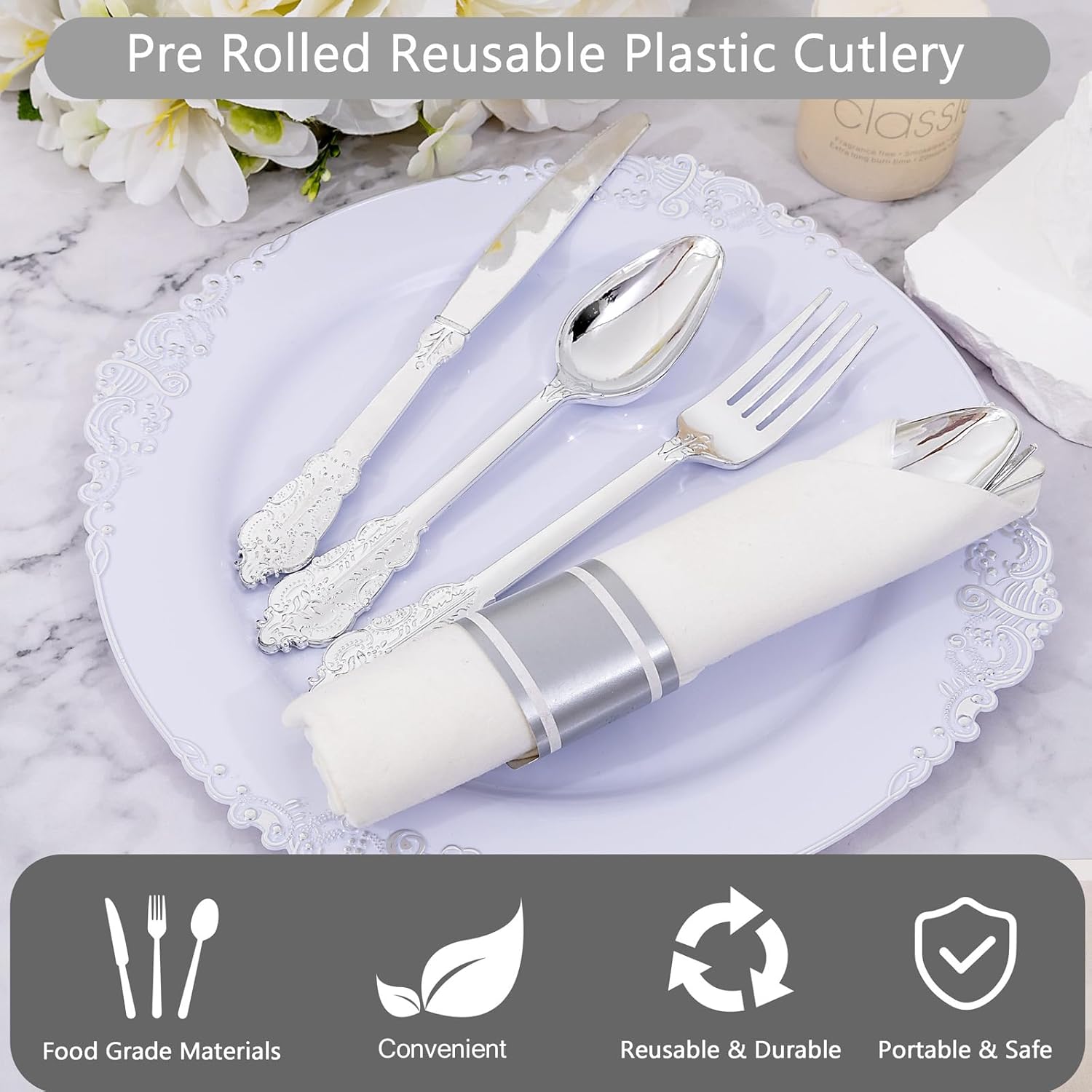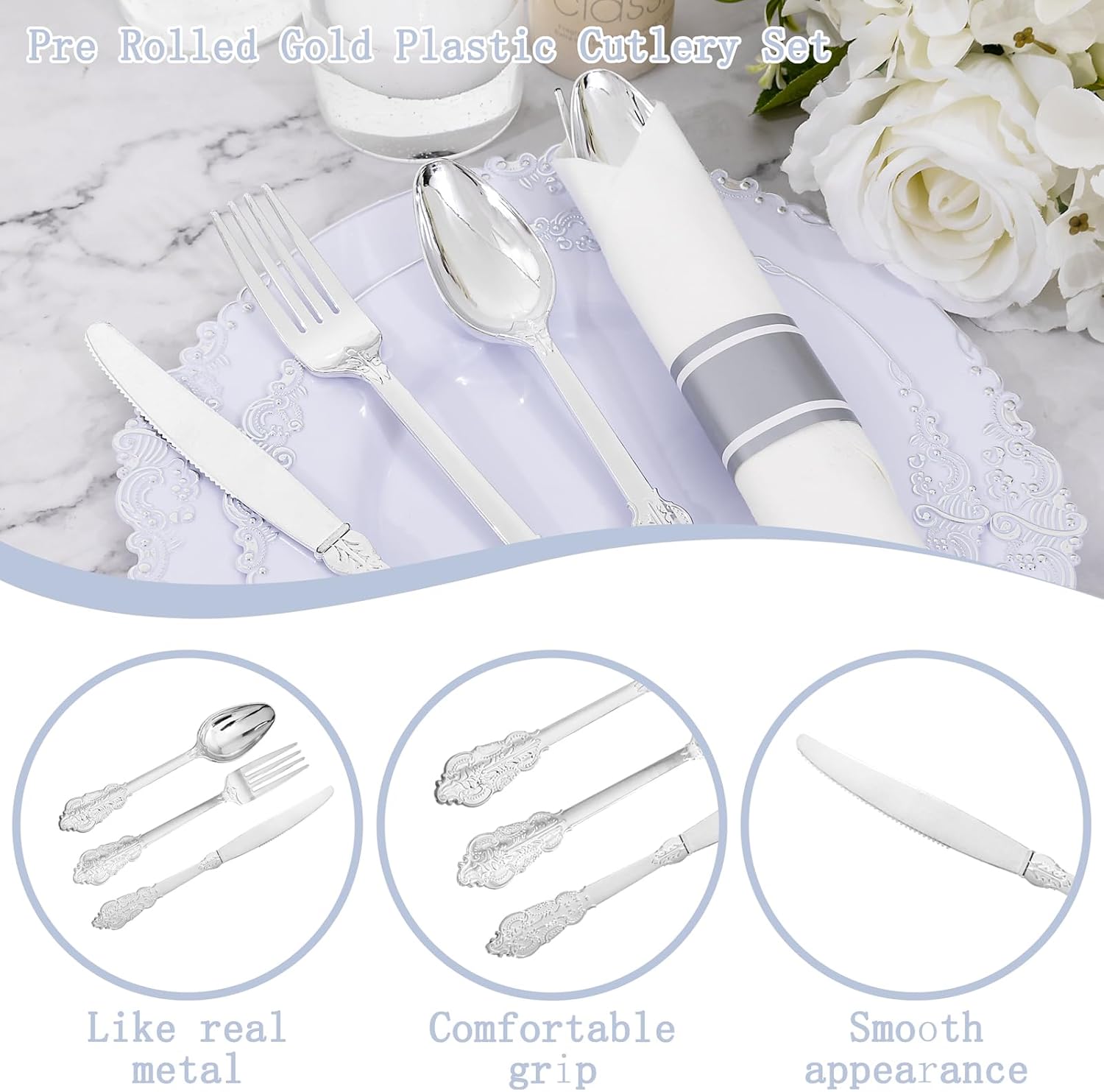 • Elegant and Convenient: The silver plastic cutlery feel smooth and shiny, maintaining the standard of luxury you want. The rolled silverware disposable are very clear and convenient for you dinners. You can throw them away afterwards without having to wash them.
